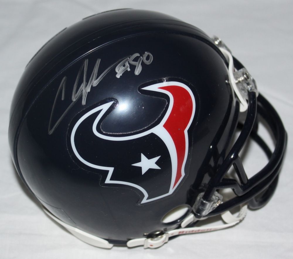 Riddell Texans mini-helmet hand-signed in silver paint pen. The autograph has been reviewed and authenticated by Global Authentics (GA) and includes their official serially numbered hologram and matching COA.