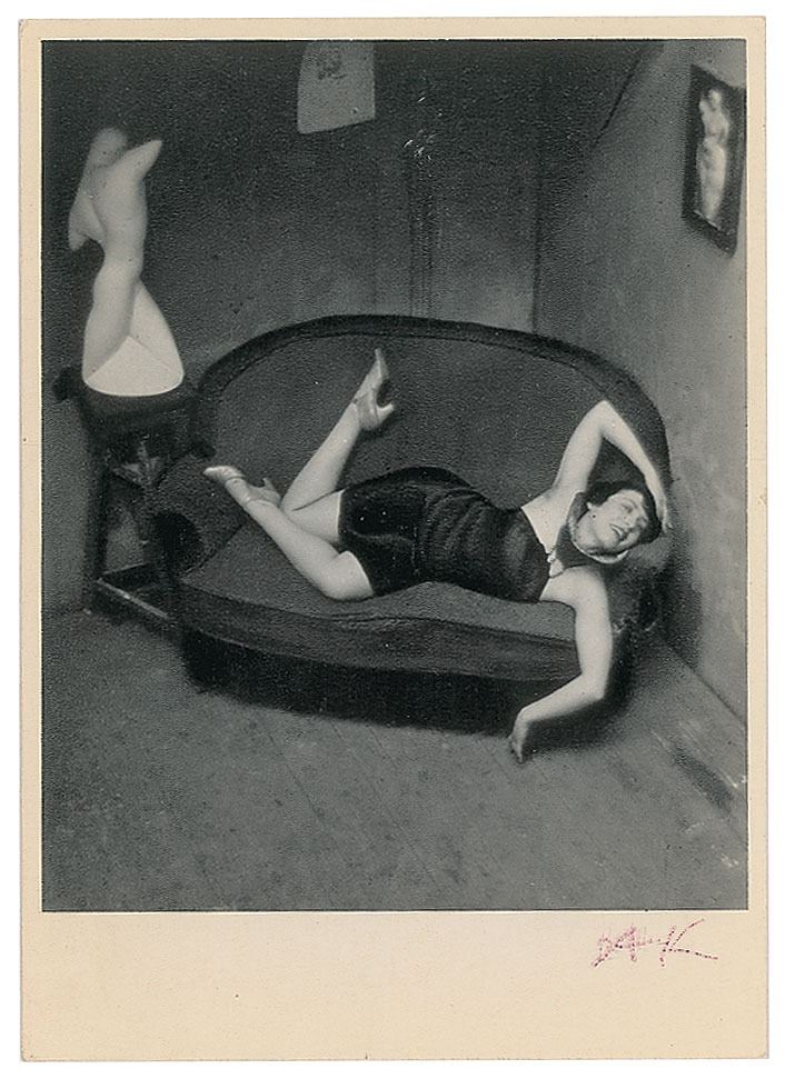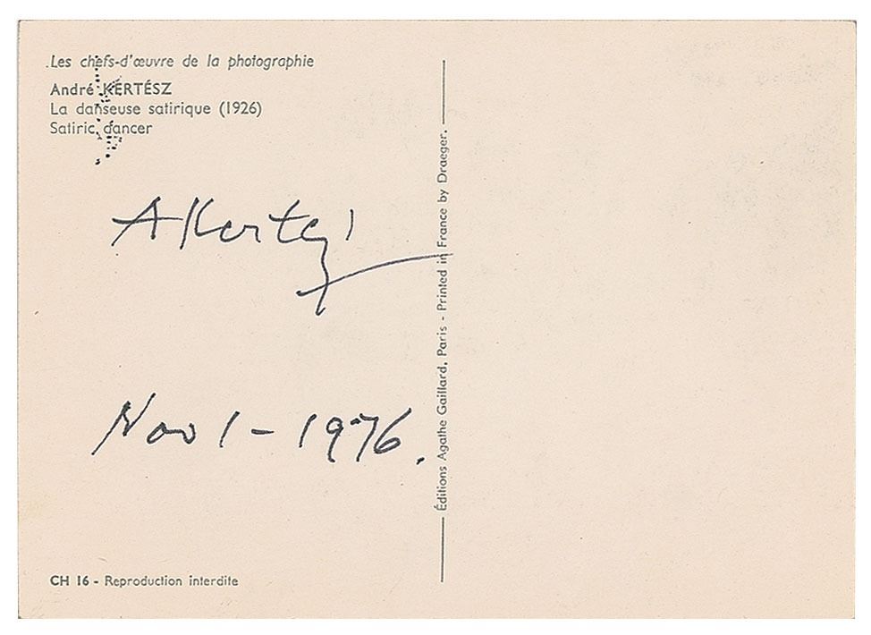 Hungarian-born photographer (1894–1985) known for his groundbreaking contributions to photographic composition and the photo essay. Appealing 4 x 5.75 postcard of his 1926 work 'La danseuse satirique,' initialed in the lower border in faint red felt tip, "A.K.," and signed on the reverse in black felt tip, "A. Kertesz, Nov 1-1976." In fine condition, with irregular ink adhesion to the initials on the front.