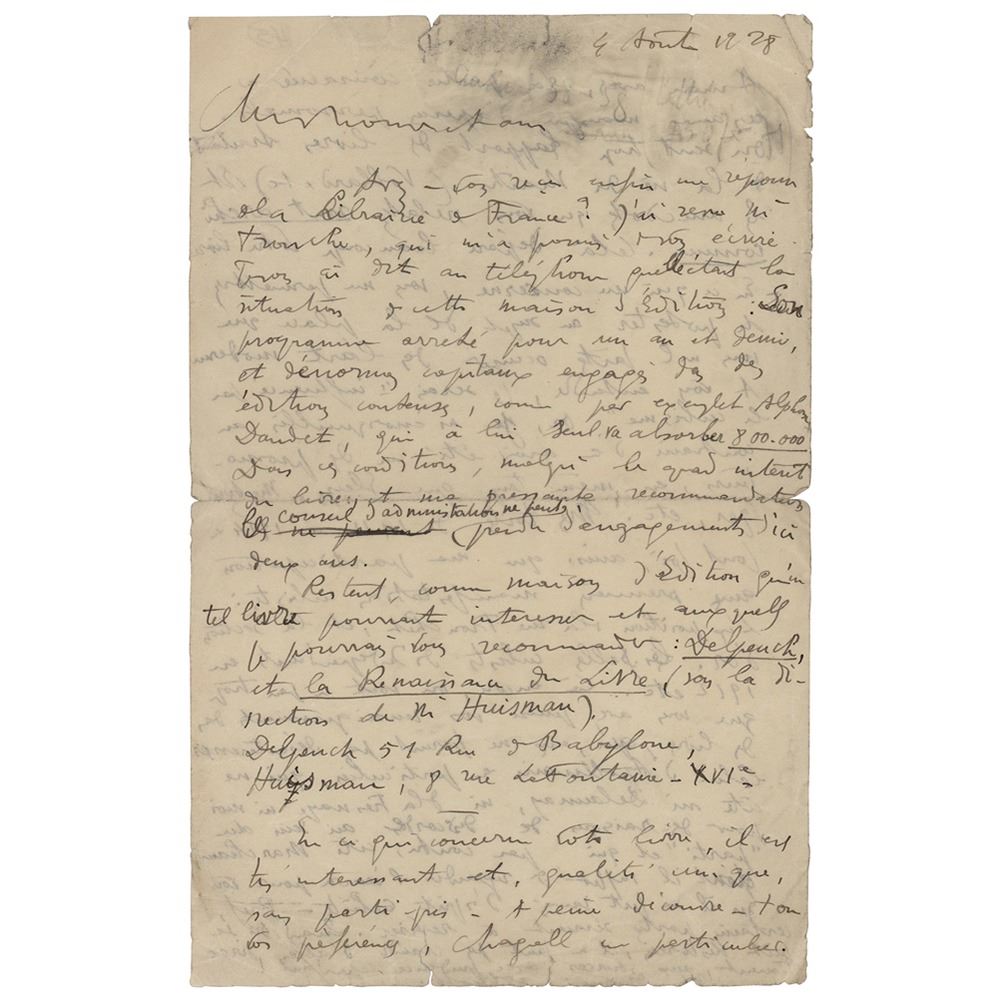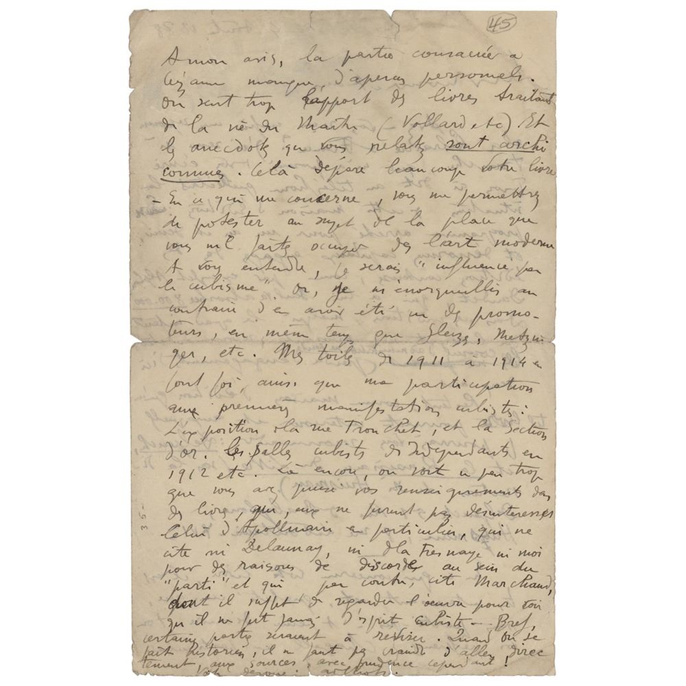 Influential French Cubist painter (1885-1962) known for his colorful figure subjects, portraits, landscapes, and still life. ALS in French, one page both sides, 5.5 x 8.75, August 4, 1928. Handwritten letter clarifying his place in the art world as a Cubist, with mentions of Chagall, Cezanne, and Vollard. In part (translated): "As far as your book is concerned, it is very interesting and, a unique virtue, without bias. One can barely discover your preferences, Chagall in particular. In my opinion, the section devoted to Cezanne is lacking in personal judgments. Your reliance on books dealing with the life of the master (Vollard, etc.) is too evident, and the anecdotes which you relate are very common knowledge. That greatly mars your book. As for the part about me, permit me to protest about the place which you assign me in modern art. According to you, I am supposed to be 'influenced by Cubism.' On the contrary, I really take pride in having been one of its promoters, along with Gleize, Metzinger, etc. My paintings between 1911 and 1914 prove it, as well as my participation in the first Cubist showings: The exposition on the Rue Tronchet, and the Section d'Or, the Cubist rooms at the Independants in 1912, etc. Here again, it is a little too evident that you have obtained your information from books, which themselves were not unprejudiced…When one becomes a historian, one must not be afraid to go directly to sources, albeit with prudence." In very good to fine condition, with several short edge tears, and light overall soiling.