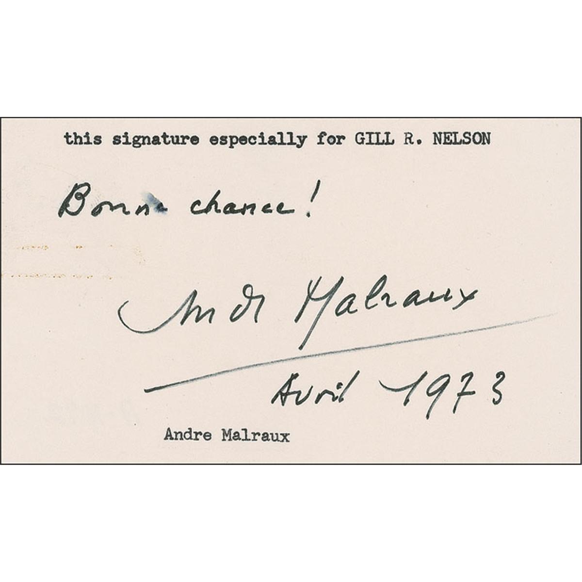 Felt tip signature, “Bonne chance! Andre Malraux, Avril 1973,” on an off-white 5 x 3 card. In fine condition, with a typed notation, brush to one letter of the sentiment, and a rusty paperclip impression at left side.