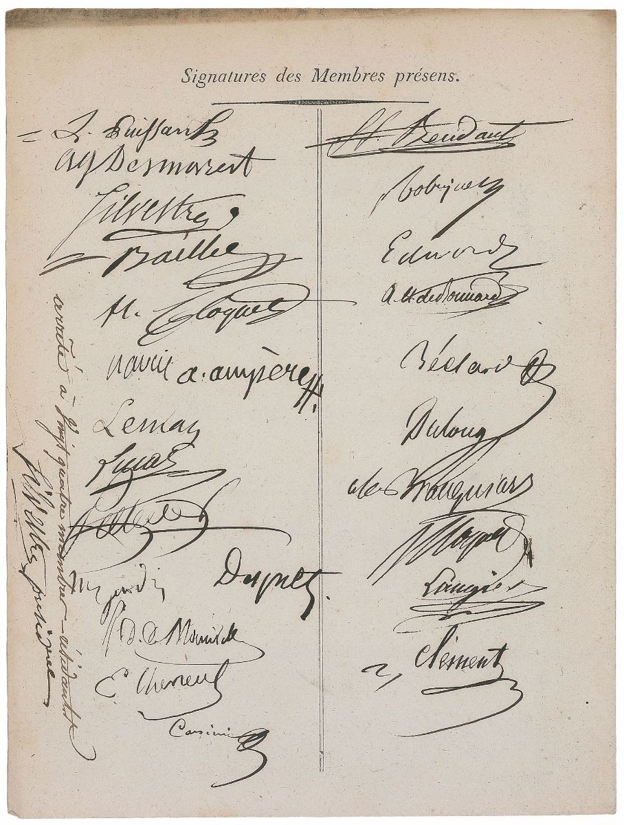 Influential French physicist (1775–1836) who pioneered the discovery and understanding of electromagnetism; a unit of electric current was named in his honor. Partly-printed DS in French, signed “A. Ampere,” two pages on two adjoining sheets, 7 x 9.25, January 27, 1821. Document listing the memoranda read before the Societe Philomatique during one of their meetings, including a “Monography of the hydrocotyle genus,” a bulletin related to a medical society, a brochure on “Natural and medical history of the different species of ipecacuanha,” and a commissary report. Signed on the adjoining page in black ink by more than twenty of the members of the society, including Ampere, chemist Michel Eugene Chevreul, and botanist Henri Cassini. In fine condition, with toning to edges and light scattered foxing.