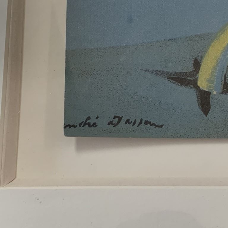 Andre Masson, Untitled, Framed Original on Paper. A mysterious craft, hovers over several smoking craters on the ground. This piece is framed in off white matting with a gold frame. It is in excellent condition.