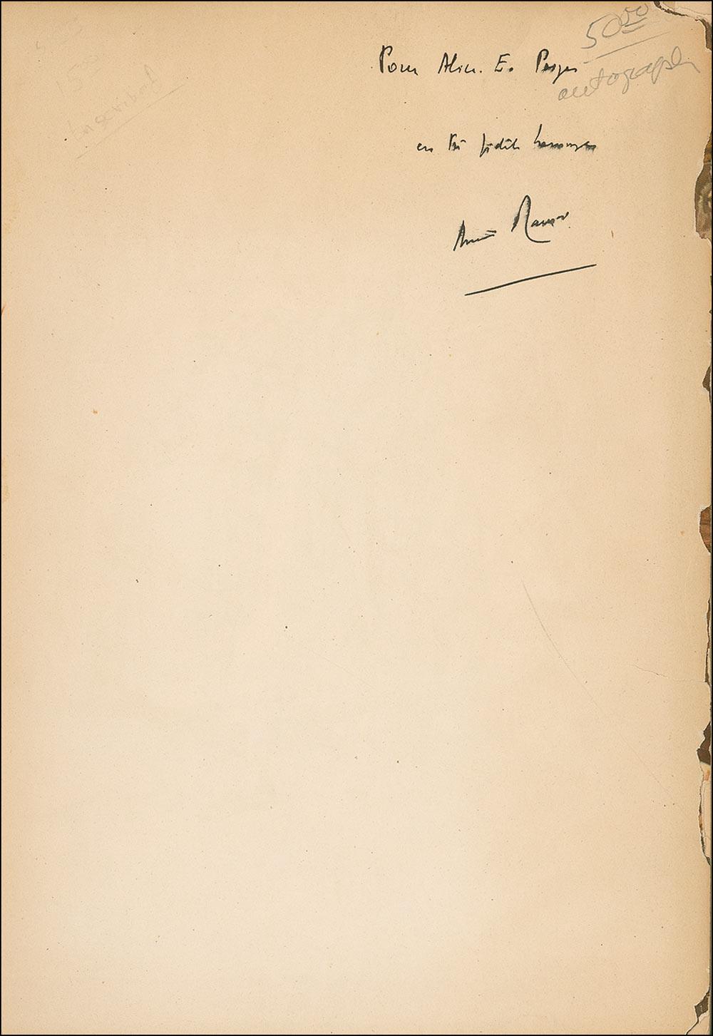 Signed book: Frederic Chopin. Later printing. NY: Brentanos, 1942. Softcover, 6.75 x 9.25, 91 pages. Signed and inscribed in French on the first free end page. In very good condition, with torn and partially separated front cover, creasing, old price written in pencil adjacent to Maurois’ inscription, chipping to the pages, scattered toning, and a missing back cover.