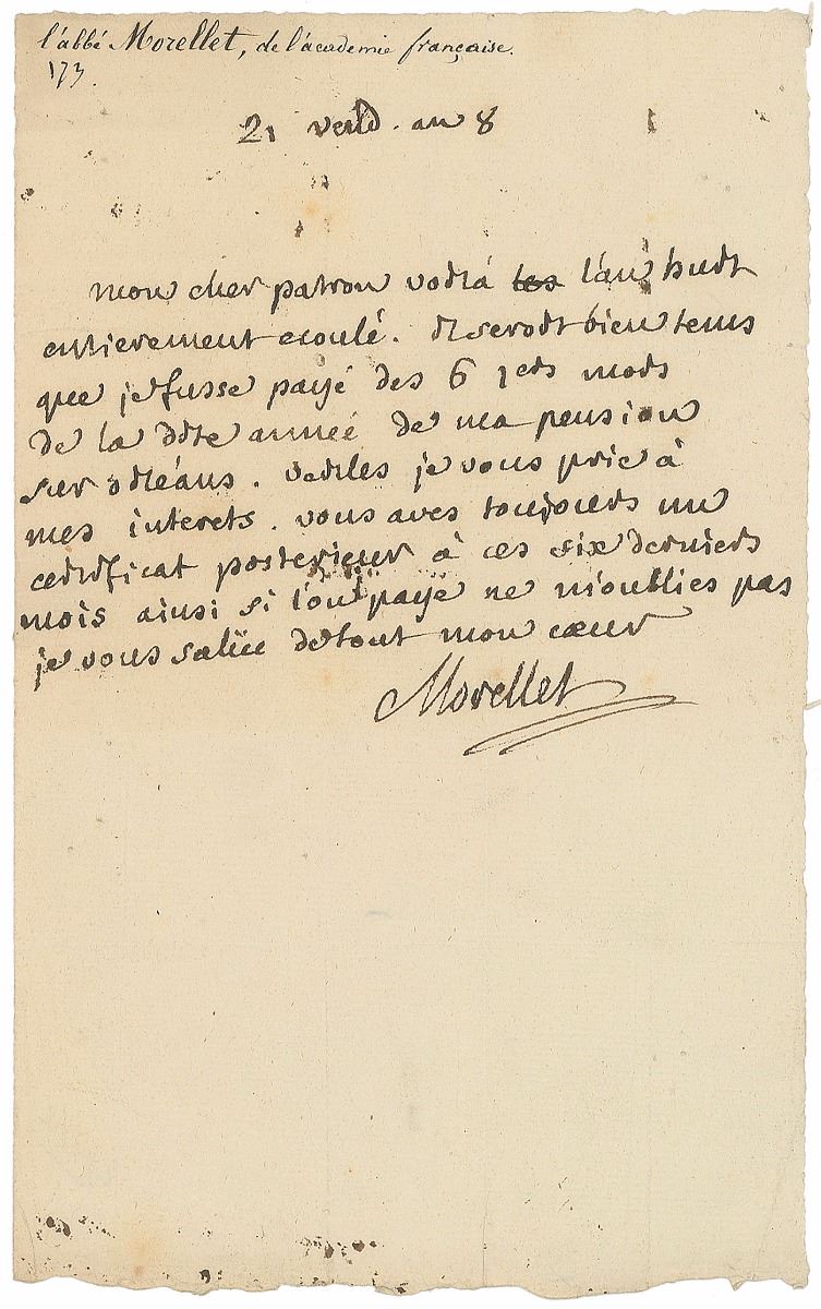 French intellectual, economist, and encyclopedia contributor (1727–1819). Untranslated ALS in French, signed “Morellet,” one page, 5.25 x 8.25, August 21, no year. In fine condition, with a few stray ink marks.