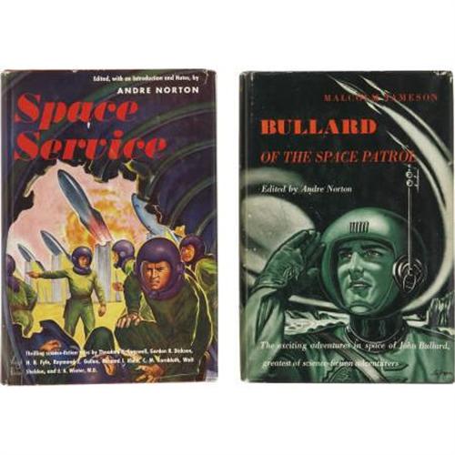 <B>Andre Norton. Two Books Edited by Her</B></I>, including: <B>Malcolm Jameson. </B></I><B><I>Bullard of the Space Patrol</B></I></B></I>. Cleveland and New York: The World Publishing Company, [1951]. First edition. Octavo. 255 pages. Publisher's black cloth with silver spine titles. In original pictorial dust jacket. Mild wear to the boards. Dust jacket lightly worn at the corners and spine ends, and mildly rubbed on the panels. Overall, a near fine copy. [and:] <B><I>Space Service</B></I></B></I>. Cleveland and New York: The World Publishing Company, [1953]. First printing. Octavo. 277 pages. Publisher's red cloth with silver and black spine titles. In original pictorial dust jacket. Textblock mildly toned around the edges. Minor edge wear to the dust jacket, else a fine copy. <I>From the Robert and Diane Yaspan Collection.</B></I><BR><BR><b>Shipping:</b> Books & Catalogs (<a target="_blank" href="http://www.heritageauctions.com/common/shipping.php">view shipping information</a>)