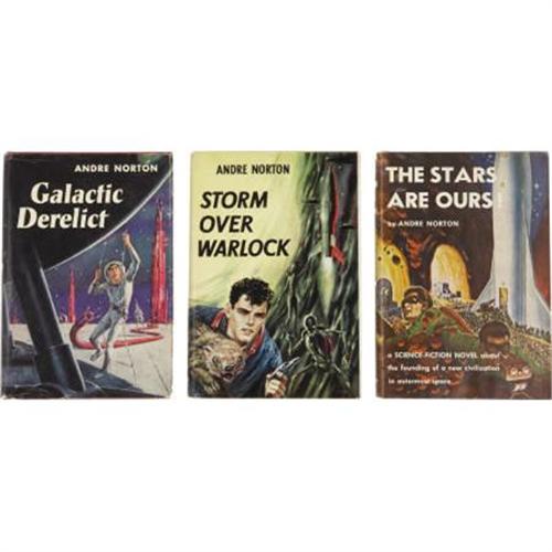 <B>Andre Norton. Three Classic Science Fiction Works</B></I>, including: <B><I>The Stars Are Ours</B></I></B></I>. Cleveland and New York: The World Publishing Company, [1954]. Later printing. Octavo. 237 pages. Dust jacket illustration by Virgil Finlay. Publisher's black cloth with yellow titles. In original pictorial dust jacket (price-clipped). Minor shelf wear to the book and dust jacket. Spine tail of book lightly bumped, else fine. [and:] <B><I>Galactic Derelict</B></I></B></I>. Cleveland and New York: The World Publishing Company, [1959]. First edition. Octavo. 224 pages. Publisher's red cloth with black titles. In original pictorial dust jacket (price-clipped). Minor shelf wear to the book. Dust jacket worn at the edges, folds, and spine ends, else a fine copy. [and:] <B><I>Storm Over Warlock</B></I></B></I>. Cleveland and New York: The World Publishing Company, [1960]. First edition. Octavo. 251 pages. Publisher's yellow cloth with black titles. In original pictorial dust jacket. Minor shelf wear to the book and dust jacket. Spine ends of dust jacket worn, else a fine copy. <I>From the Robert and Diane Yaspan Collection.</B></I><BR><BR><b>Shipping:</b> Books & Catalogs (<a target="_blank" href="http://www.heritageauctions.com/common/shipping.php">view shipping information</a>)