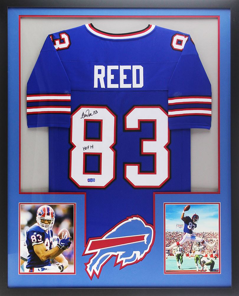 Custom frame measures approximately 34" x 42" in size and features a jersey which has been hand-signed in black felt-tip pen by Andre Reed (HOF).
