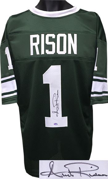 Andre Rison was a star player at Flint Northwestern High School and in college at Michigan State University. As a senior at Michigan State, Rison had 30 receptions for 709 yards and 5 TDs; he was a prominent contributor to the 1987 Michigan State squad that won the Rose Bowl on January 1, 1988. This is a Andre Rison Michigan State Spartans signed TB Green unlicensed custom-prostyle jersey with twill stitched nameplate and numbers. Size XL. Schwartz Sports Hologram and Certificate of Authenticity from Athlon Sports Collectibles.