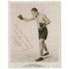 French professional boxer (1900–1969) who held the world featherweight title from 1928 to 1929. Vintage glossy 8 x 10 photo of Routis in a boxing pose, signed and inscribed in fountain pen “I am strong, I drink I eat to the House of Frank. A. Routis 1928.” In very good condition, with moderate creasing, edge chipping, and several small edge tears.