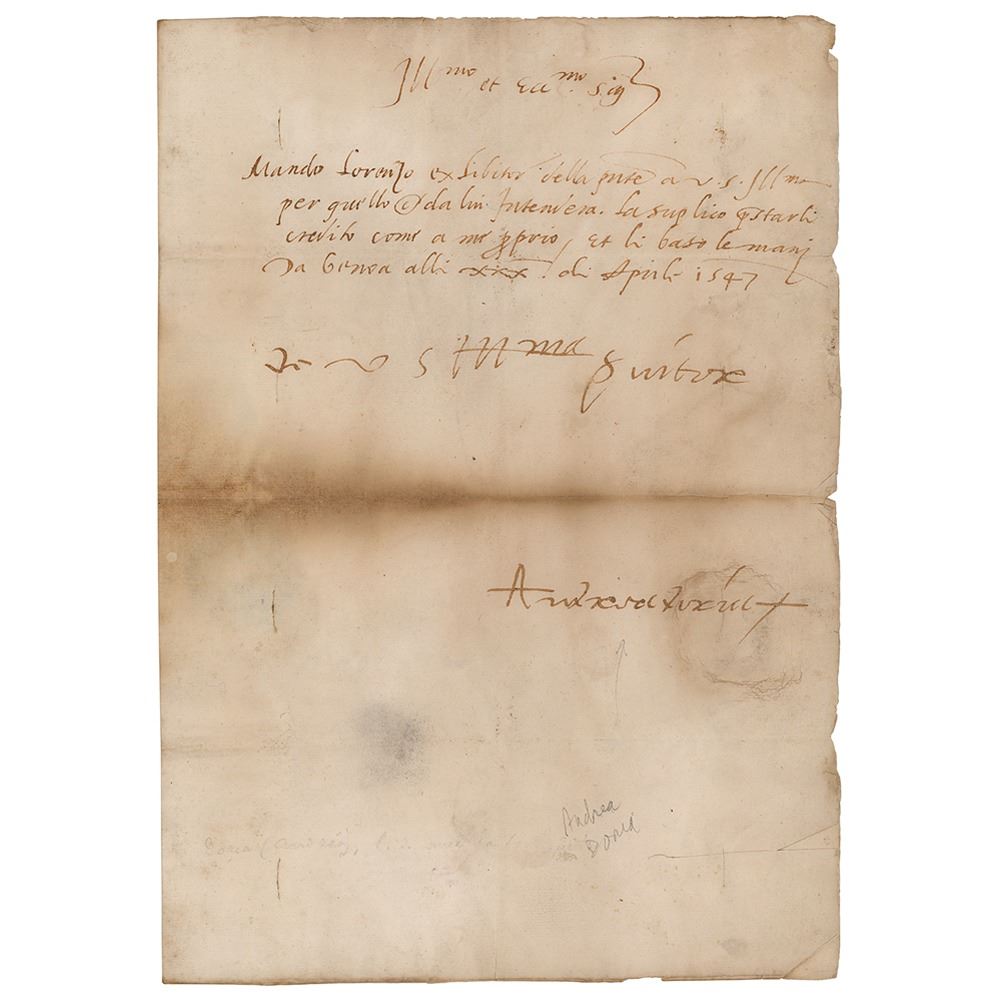 ALS in Italian, signed “Andrea Doria,†one page, 8.5 x 12, April 30, 1547. Handwritten letter concerning a payment that was being brought by “Lorenzo.†The integral address leaf, also addressed by Doria, is to Ferdinand Gonzaga (1507-57) Italian Prince, Captain General, Viceroy of Sicily, and, at the time of this letter, the Governor of Milan. Gonzaga dockets the address leaf “From Doria, 30 April, 1547.†In very good to fine condition, with scattered light soiling, and heavy toning along the central horizontal fold.