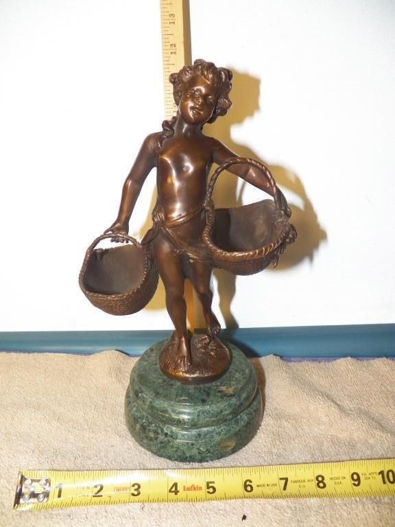 Statue is about 9 1/4 inches tall sitting atop a 2 inch Green marble base for a total height of about 11 1/4 inches. Beautifully detailed of a young maiden carrying a basket in each hand. Great condition, it has a nice