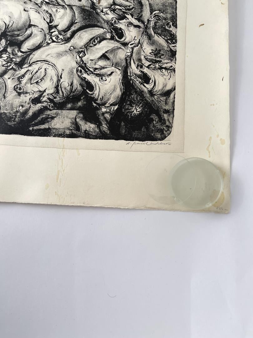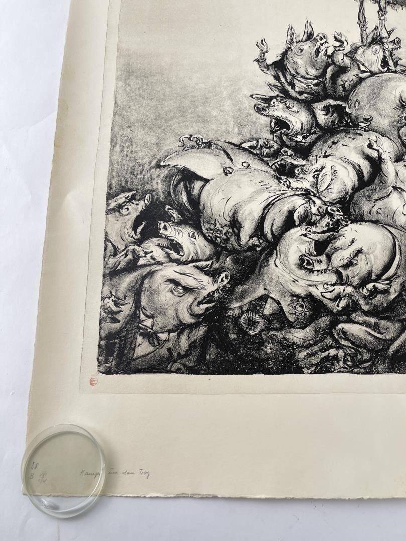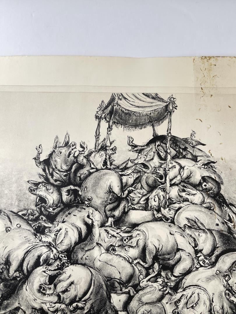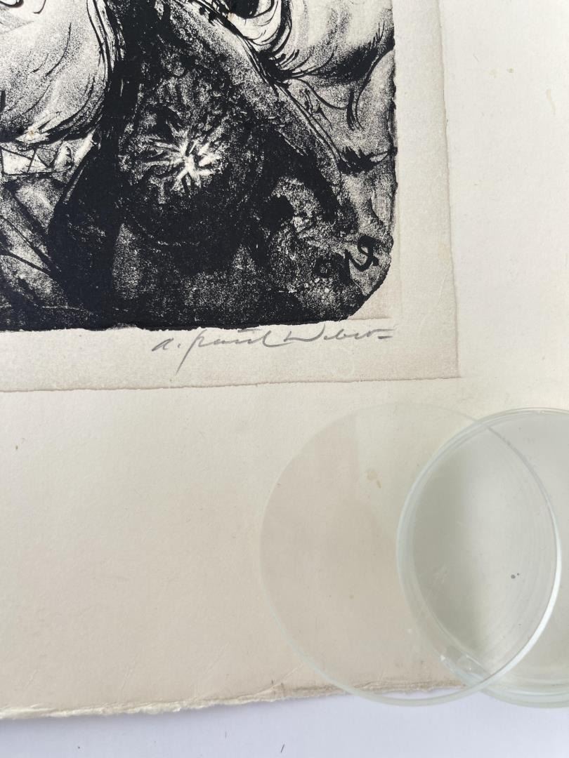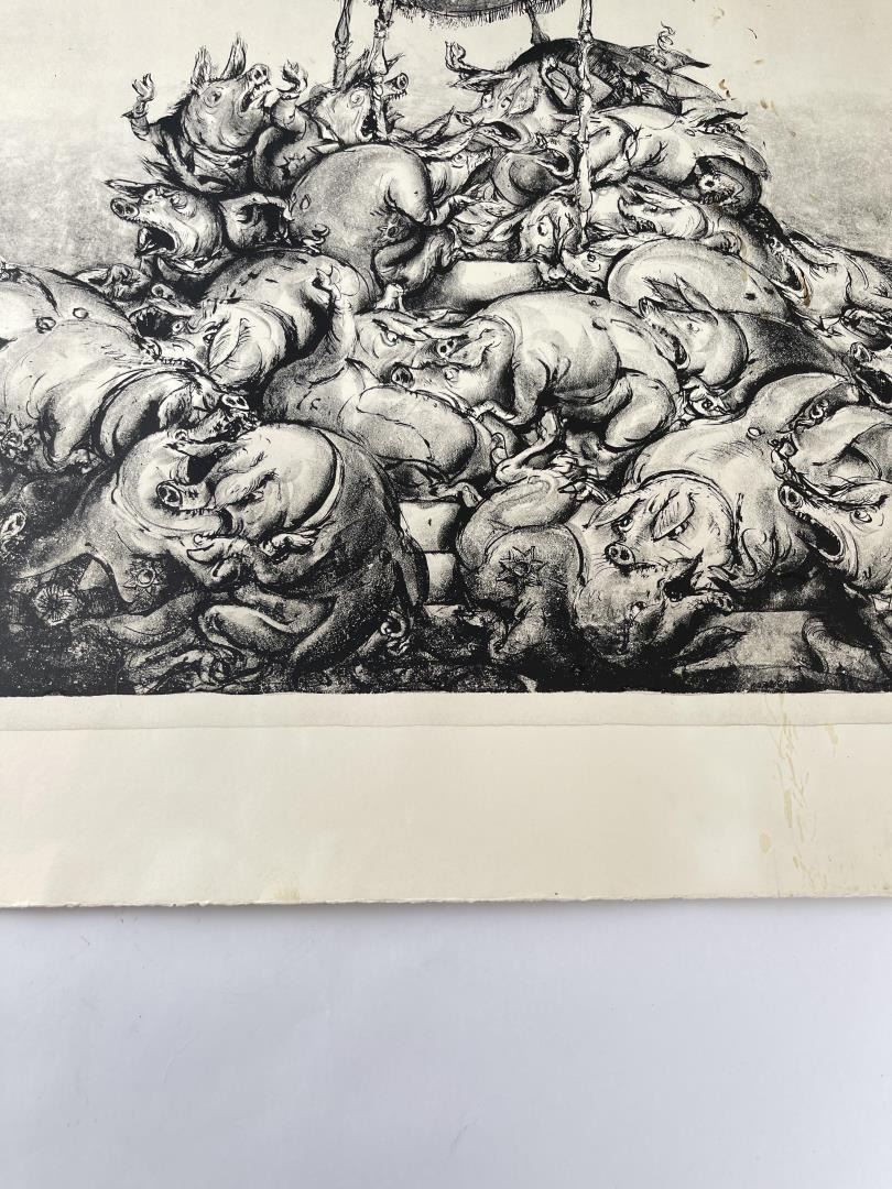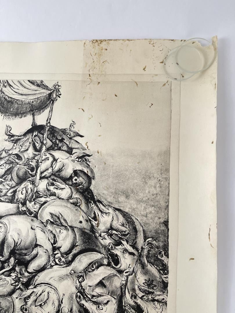 25 1/4" by 30". Needs a bit of conservation work. Andreas Paul Weber (1883/93 - 1980) was active/lived in Germany. Andreas Weber is known for Painting, graphics. Andreas Paul Weber attended, for a short period of time, the Kunstgewerbeschule Erfurt. He was a member of the Romanticist youth movement ‘Jung-Wandervogel’. During many hikes with the group he received a lot of inspiration for the nature depictions in his works and he started creating his first autodidactic lithographs. He served in the military service during the First World War. He was able to work as a draughtsman at the Eastern frontier for the magazine of the 10th Army.