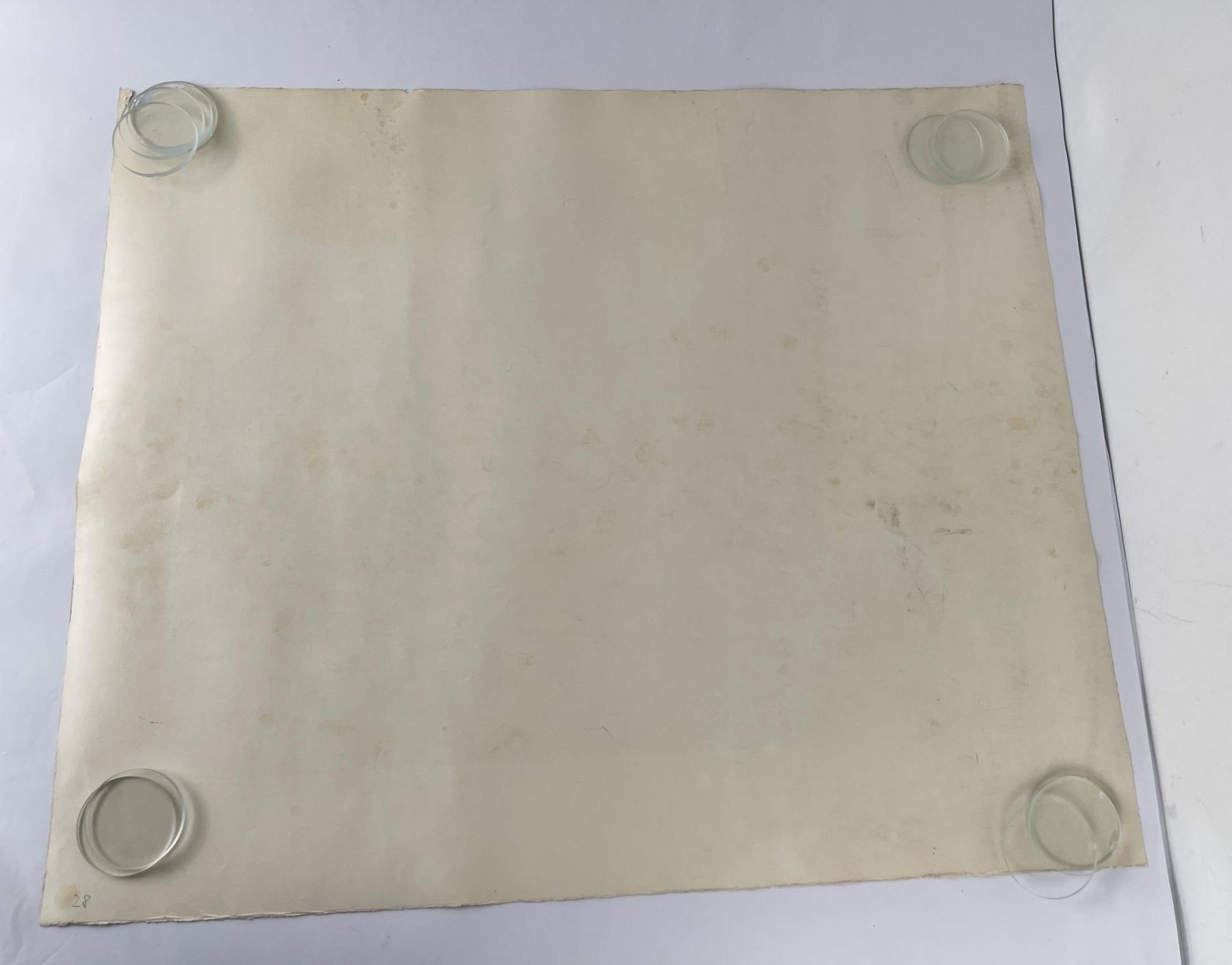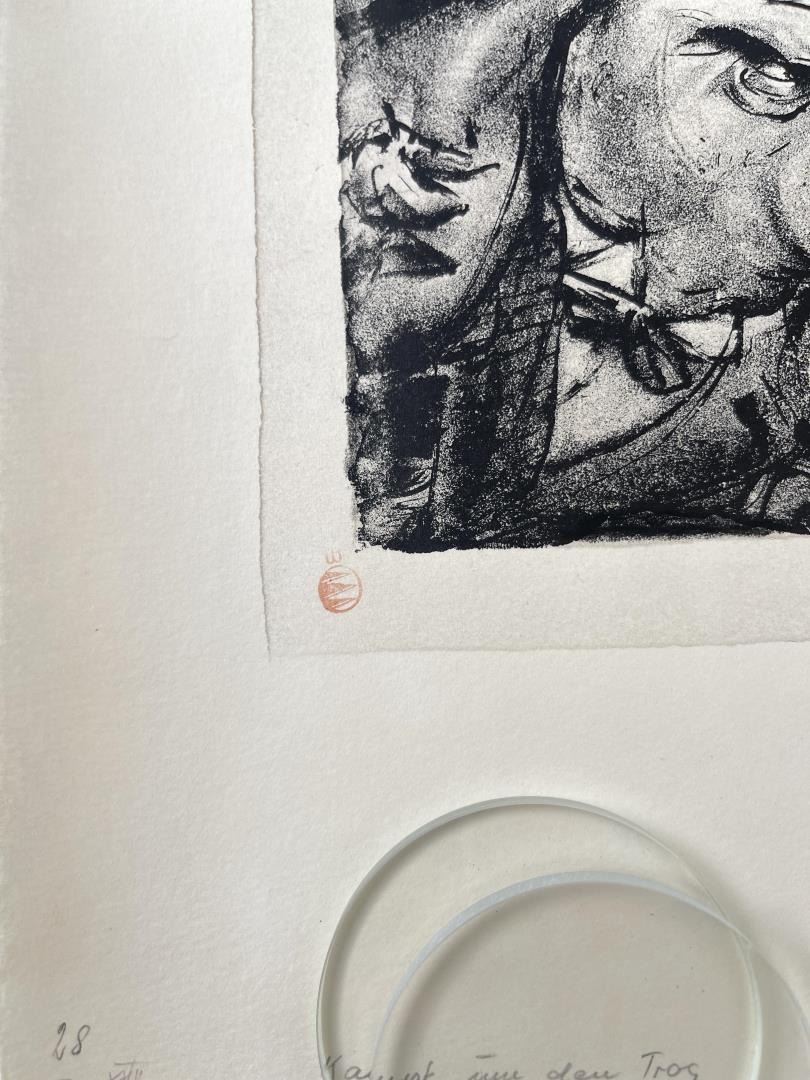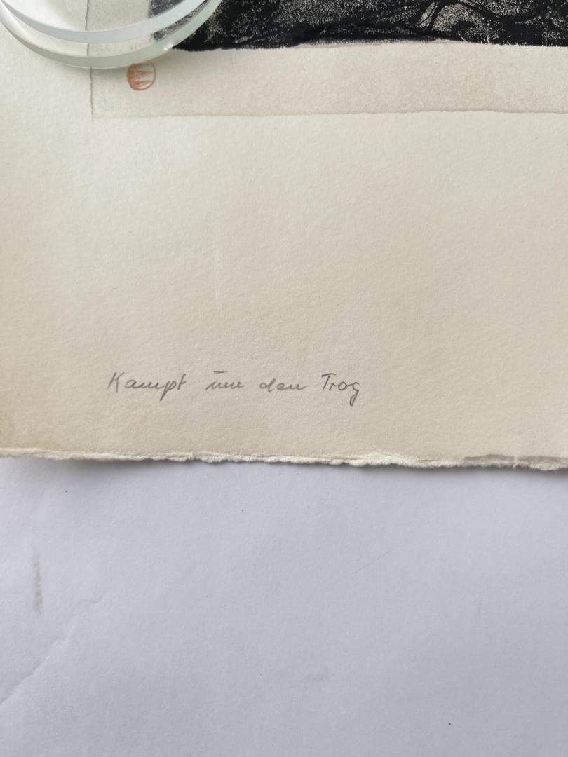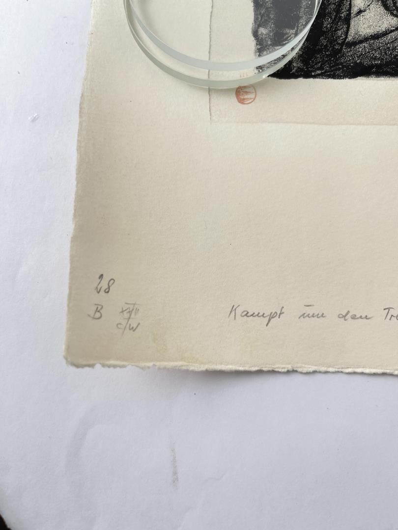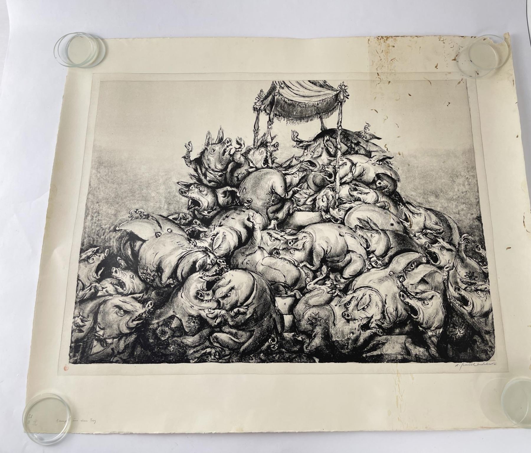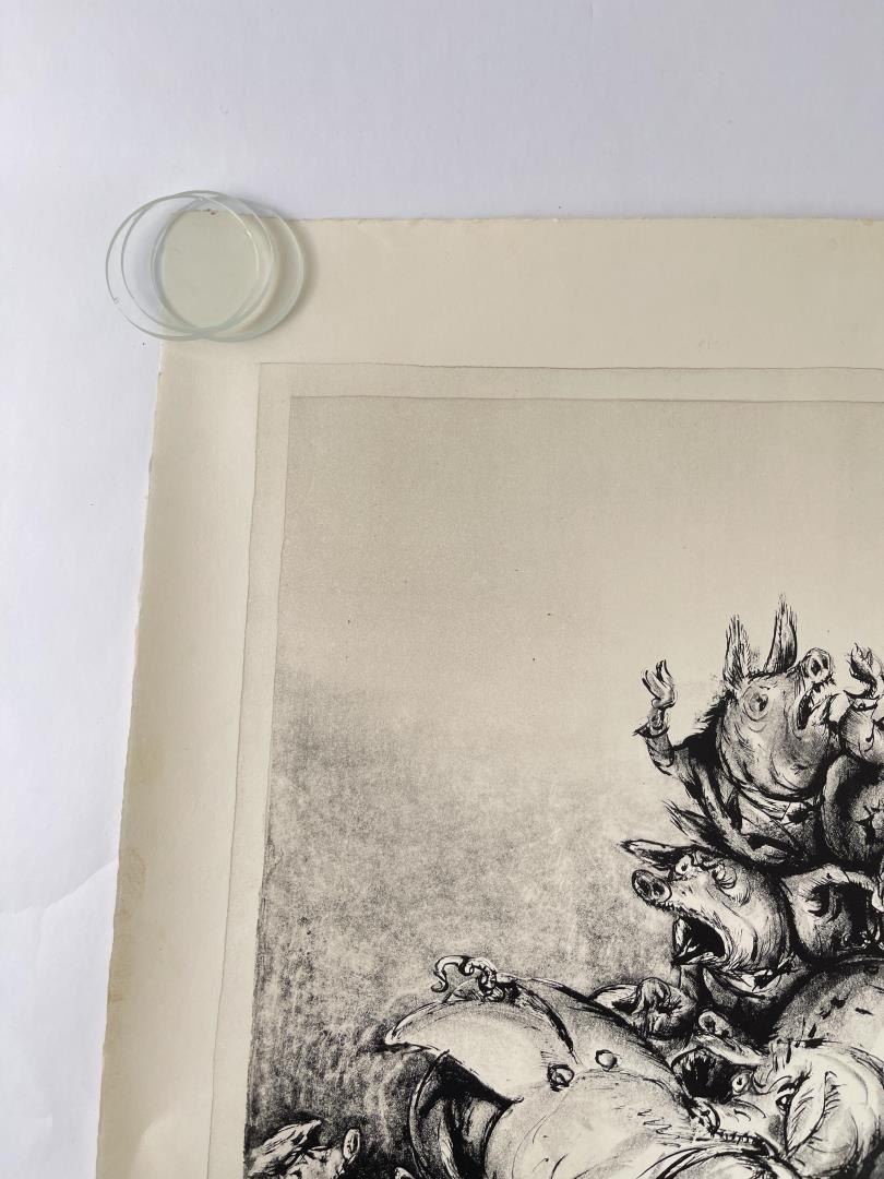 25 1/4" by 30". Needs a bit of conservation work. Andreas Paul Weber (1883/93 - 1980) was active/lived in Germany. Andreas Weber is known for Painting, graphics. Andreas Paul Weber attended, for a short period of time, the Kunstgewerbeschule Erfurt. He was a member of the Romanticist youth movement ‘Jung-Wandervogel’. During many hikes with the group he received a lot of inspiration for the nature depictions in his works and he started creating his first autodidactic lithographs. He served in the military service during the First World War. He was able to work as a draughtsman at the Eastern frontier for the magazine of the 10th Army.