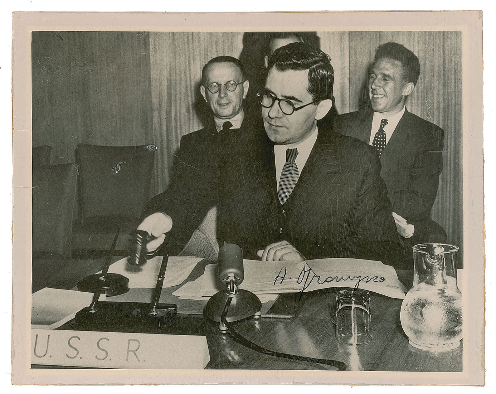 Vintage glossy 9 x 7 photo of Gromyko speaking before the United Nations, signed in fountain pen in Cyrillic. Affixed to a same-size sheet and in very good condition, with heavy overall crazing to the emulsion, and two small tears to the chair to Gromyko's right.