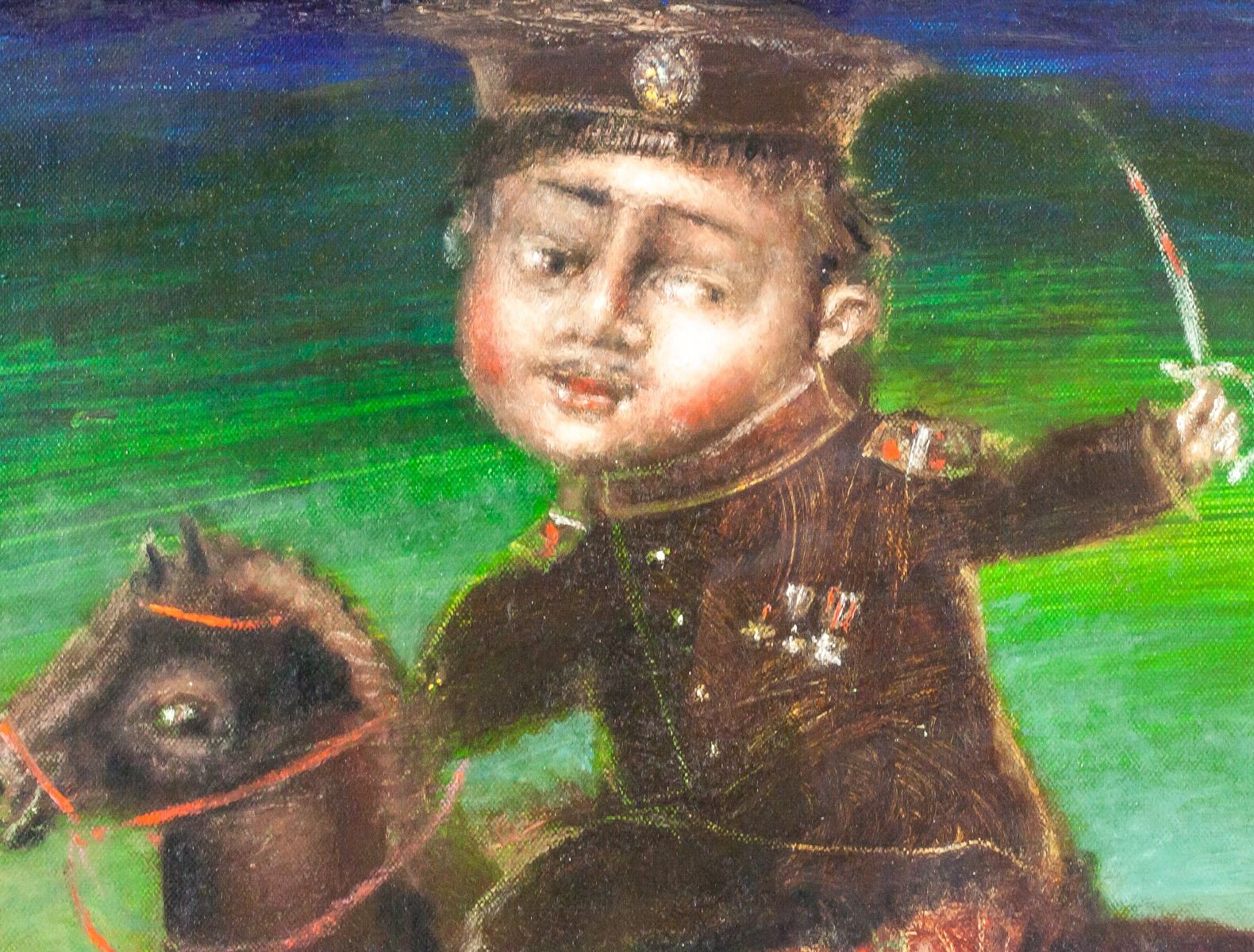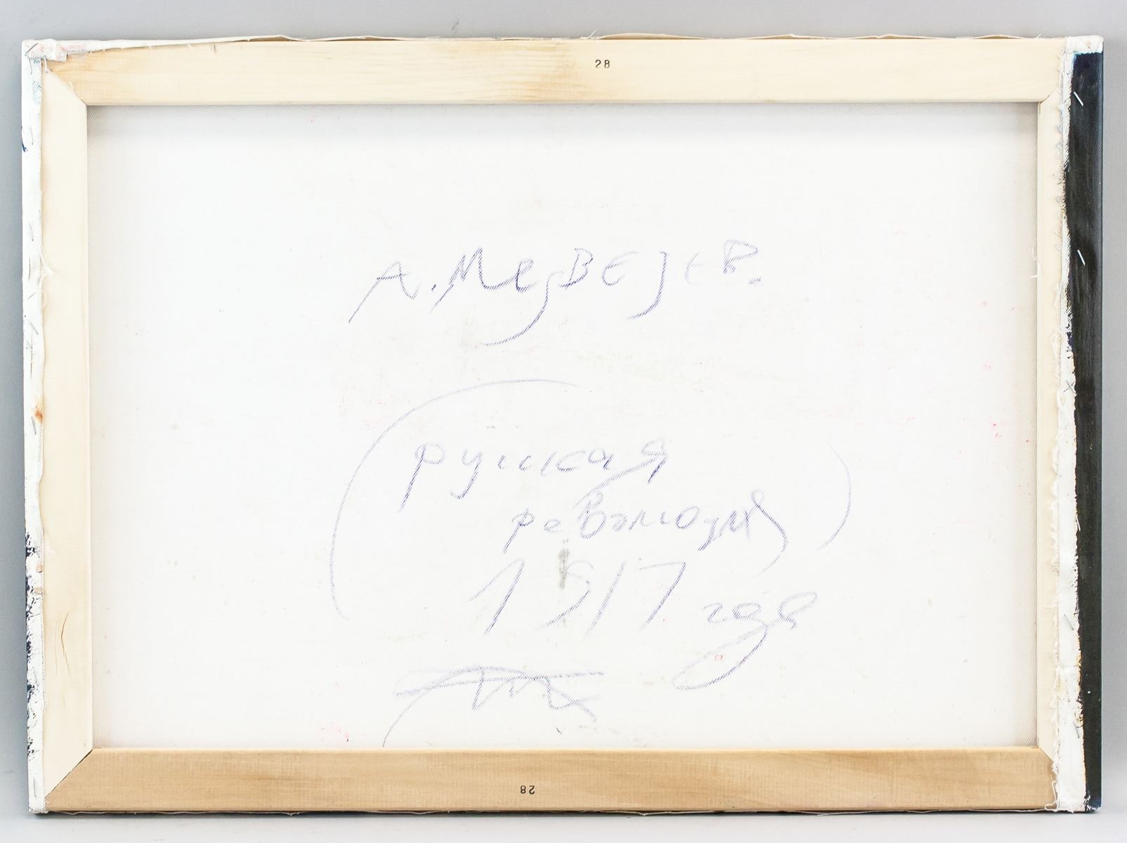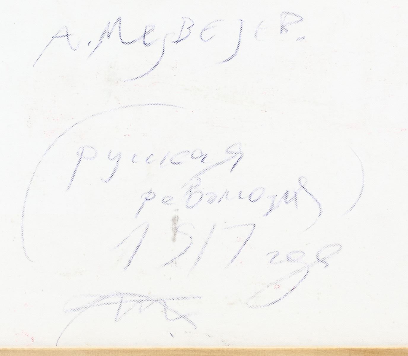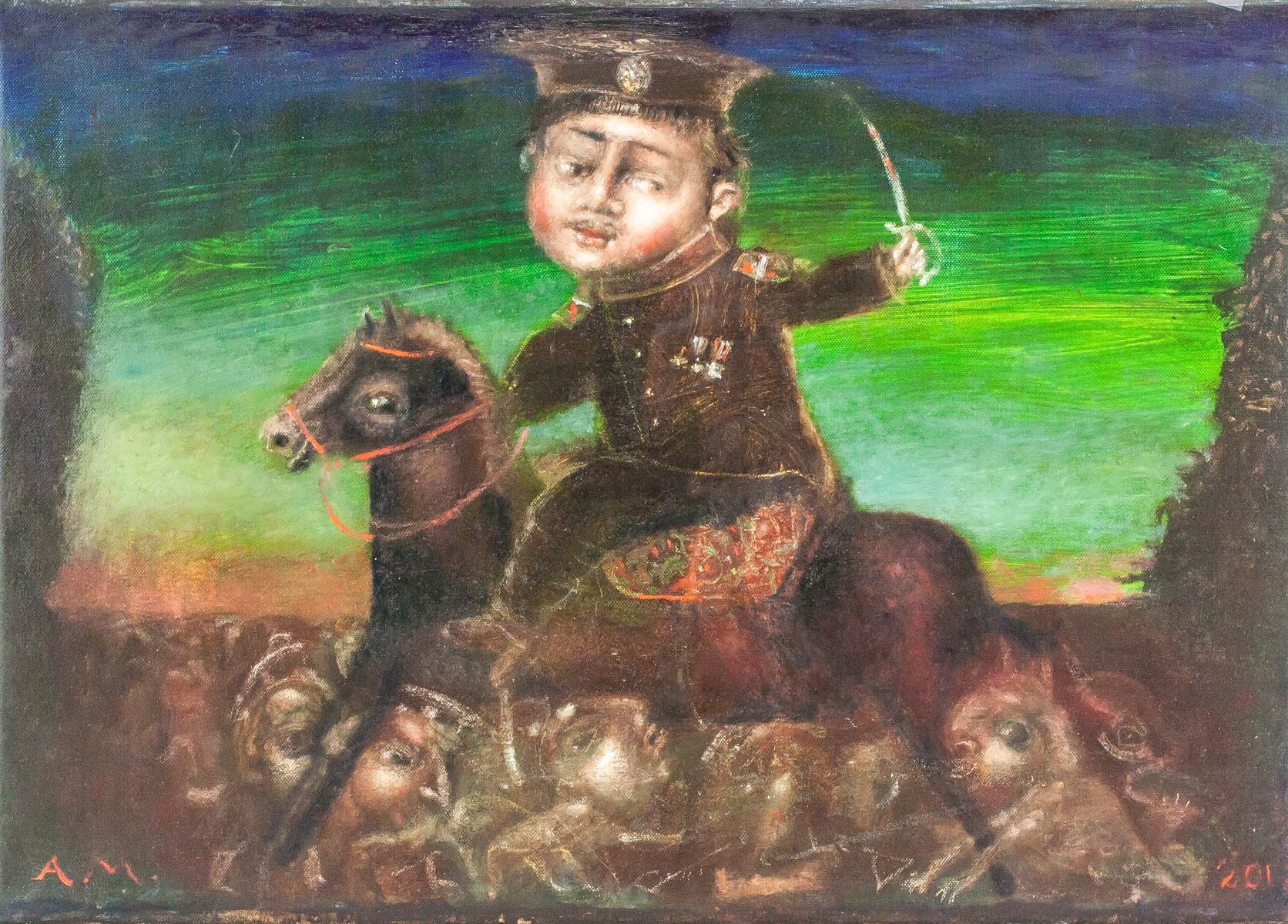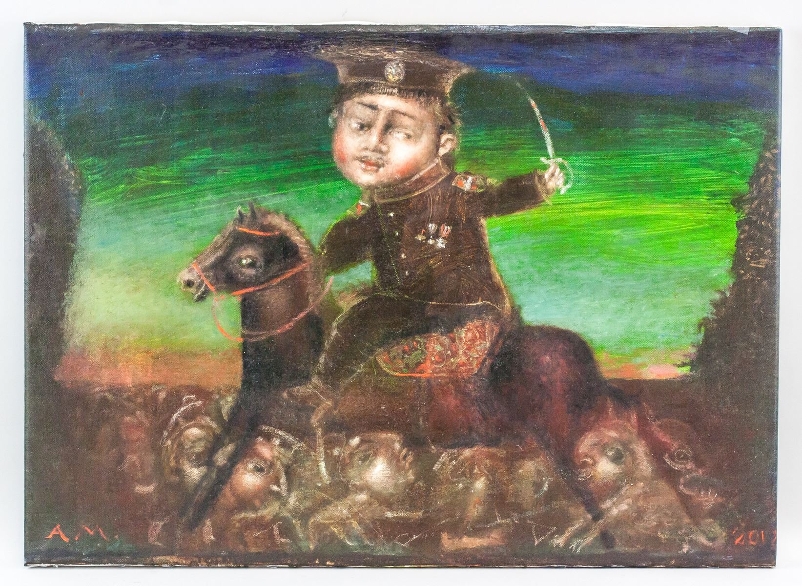 Oil on canvas. Featuring a portrait scene. Entitled, "Russian Revolution". Signed by Andrei Medvedev (1960-, Russian) and dated 2017 on the lower left and lower right corner, respectively. Inscribed with artist's signature, title, date, and dimensions on verso. 51 x 71 cm (20 x 28 in). Andrei Medvedev has had several gallery and museum exhibitions, including at the Ludwig Museum of Contemporary Art. Several works by the artist have been sold at auction, including 'Ladoga-2M' sold at Vladey 'Spring Auction' in 2015 for $14,467. “The space which he creates seems to be devoid of gravity, giving the impression that the individuals portrayed are floating above the ground. His compositions, the positions of his figures and the apparent lack of gravity provide his work with a mystery all of its own. The imperfections and strange juxtapositions summon up questions about our existence and the absurdity of life, but likewise the beauty of the glaring contrasts of the 21st century”Peter Van Rooy (German professor and art critic). Provenance: Acquired from the artist.