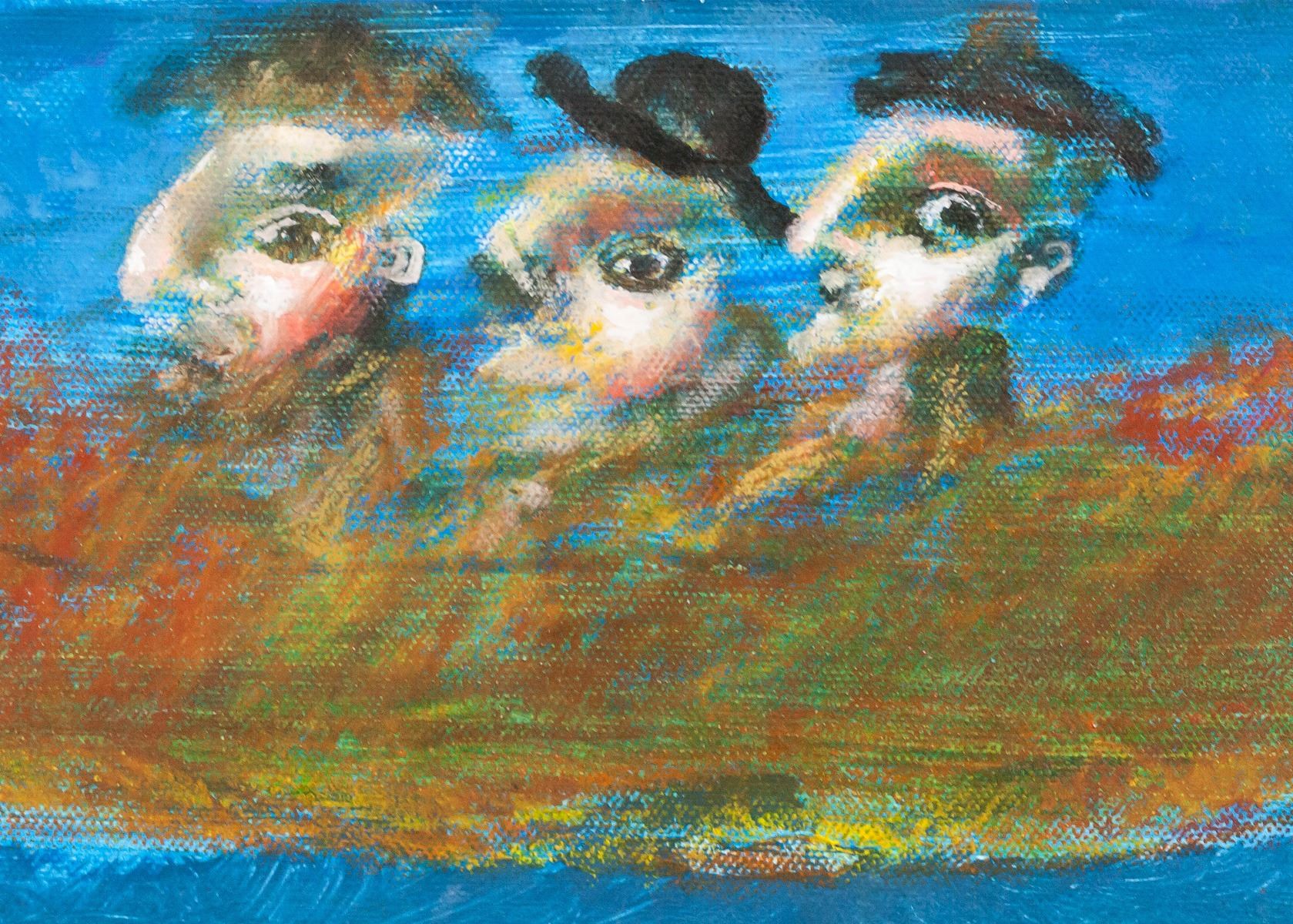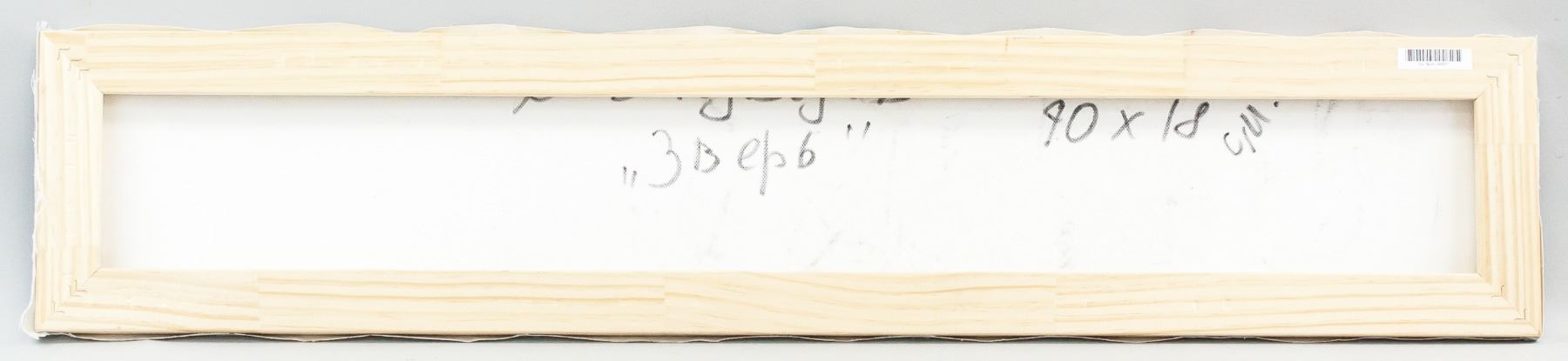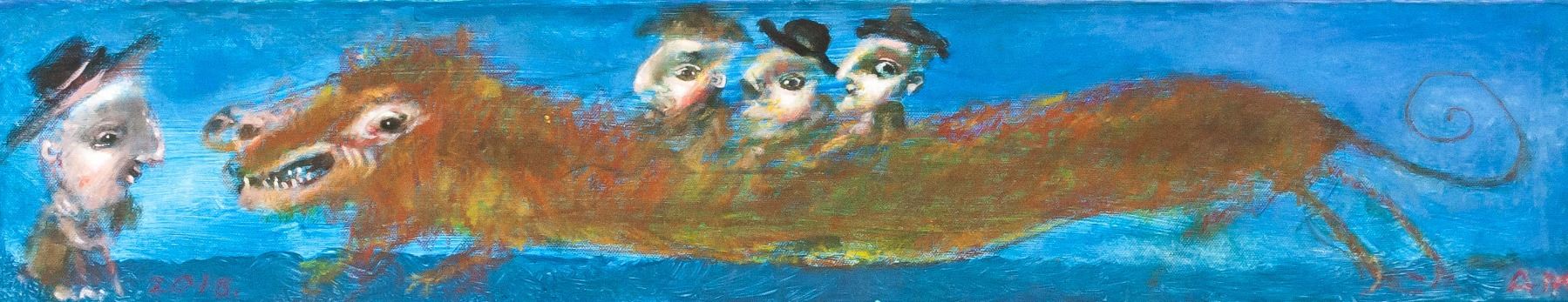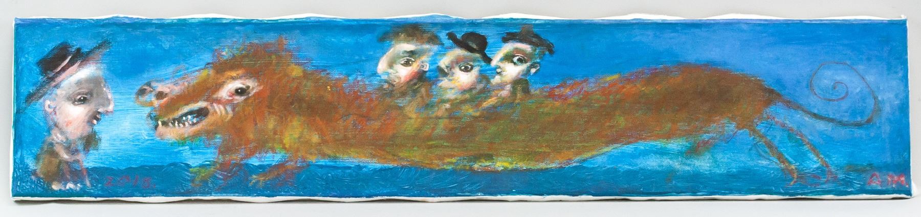 Oil on canvas. Featuring a surrealist portrait scene of three figures atop a beast facing another figure. Signed by Andrei Medvedev (1960-, Russian) on the lower right corner with initials. Entitled "Beast" with dimensions on verso. 18 x 89 cm (7 x 35 in). Provenance: Acquired from the artist
