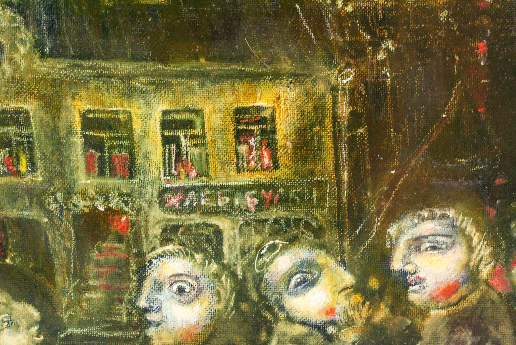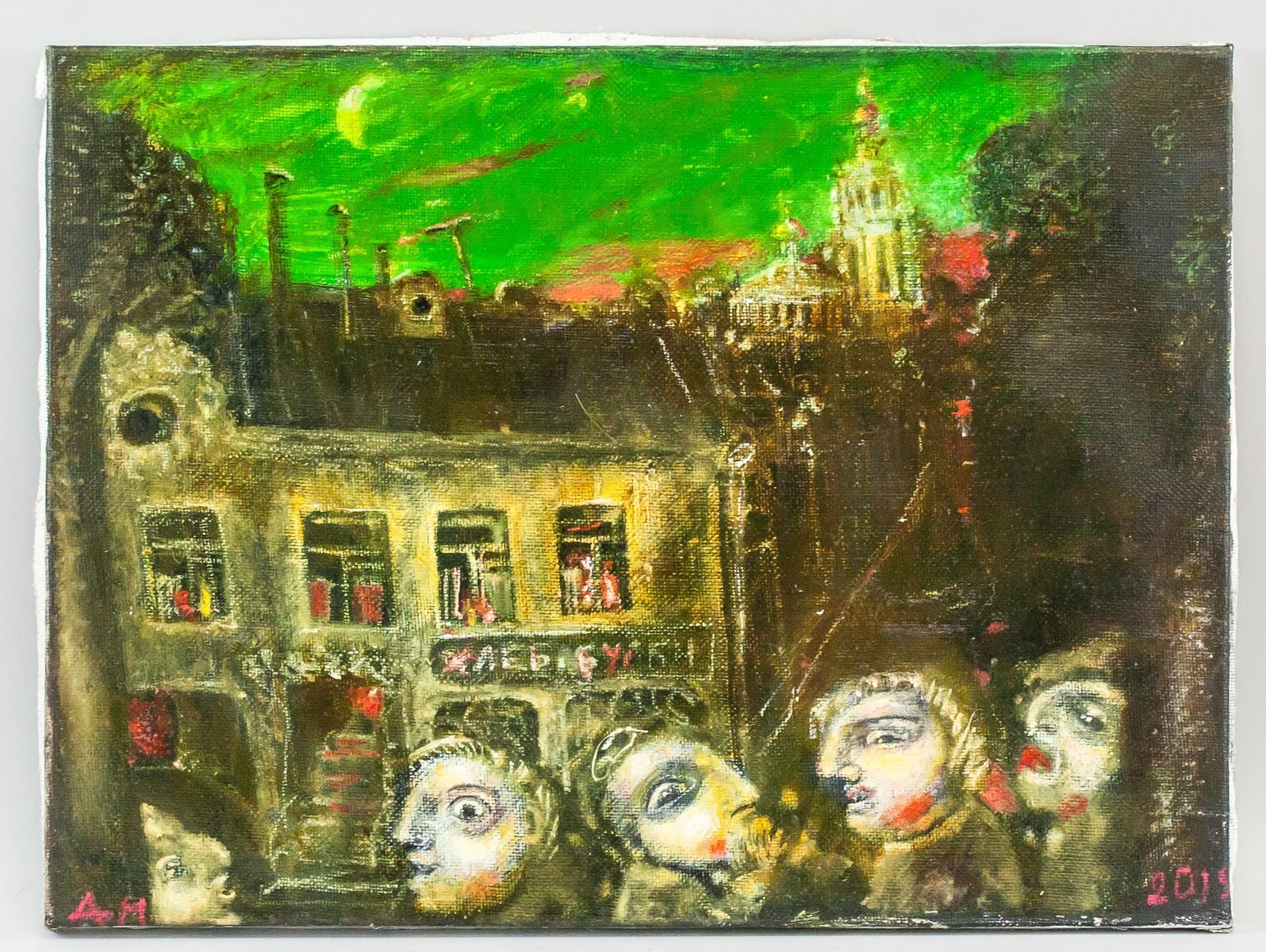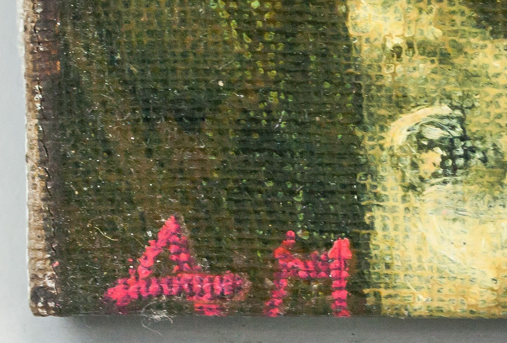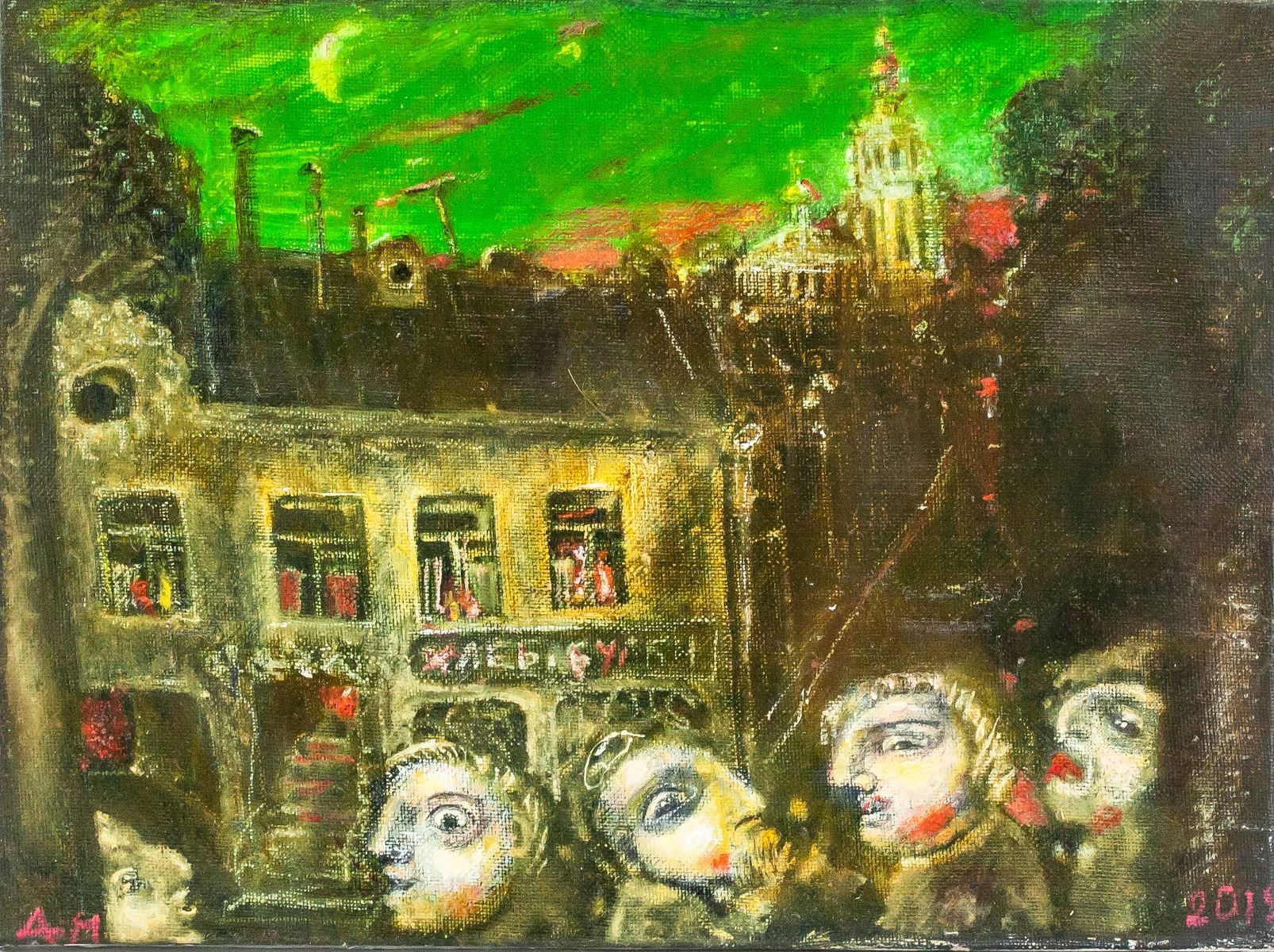 Oil on canvas. Featuring a portrait scene. Entitled, "Small Town". Signed by Andrei Medvedev (1960-, Russian) and dated 2019 on the lower left and lower right corner, respectively. Inscribed with artist's signature, title, date, and dimensions on verso. 38 x 51 cm (15 x 20 in). Andrei Medvedev has had several gallery and museum exhibitions, including at the Ludwig Museum of Contemporary Art. Several works by the artist have been sold at auction, including 'Ladoga-2M' sold at Vladey 'Spring Auction' in 2015 for $14,467. “The space which he creates seems to be devoid of gravity, giving the impression that the individuals portrayed are floating above the ground. His compositions, the positions of his figures and the apparent lack of gravity provide his work with a mystery all of its own. The imperfections and strange juxtapositions summon up questions about our existence and the absurdity of life, but likewise the beauty of the glaring contrasts of the 21st century”Peter Van Rooy (German professor and art critic). Provenance: Acquired from the artist.