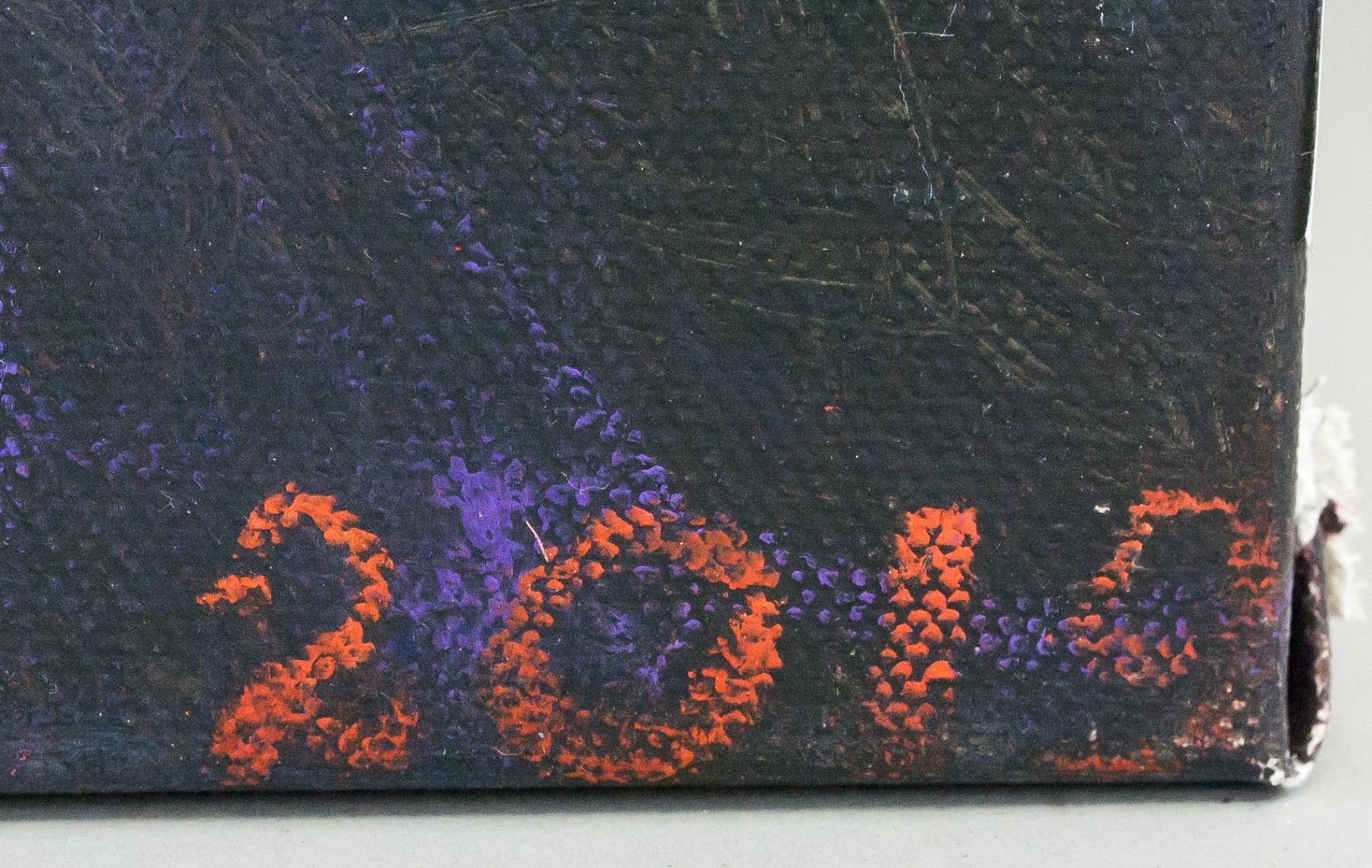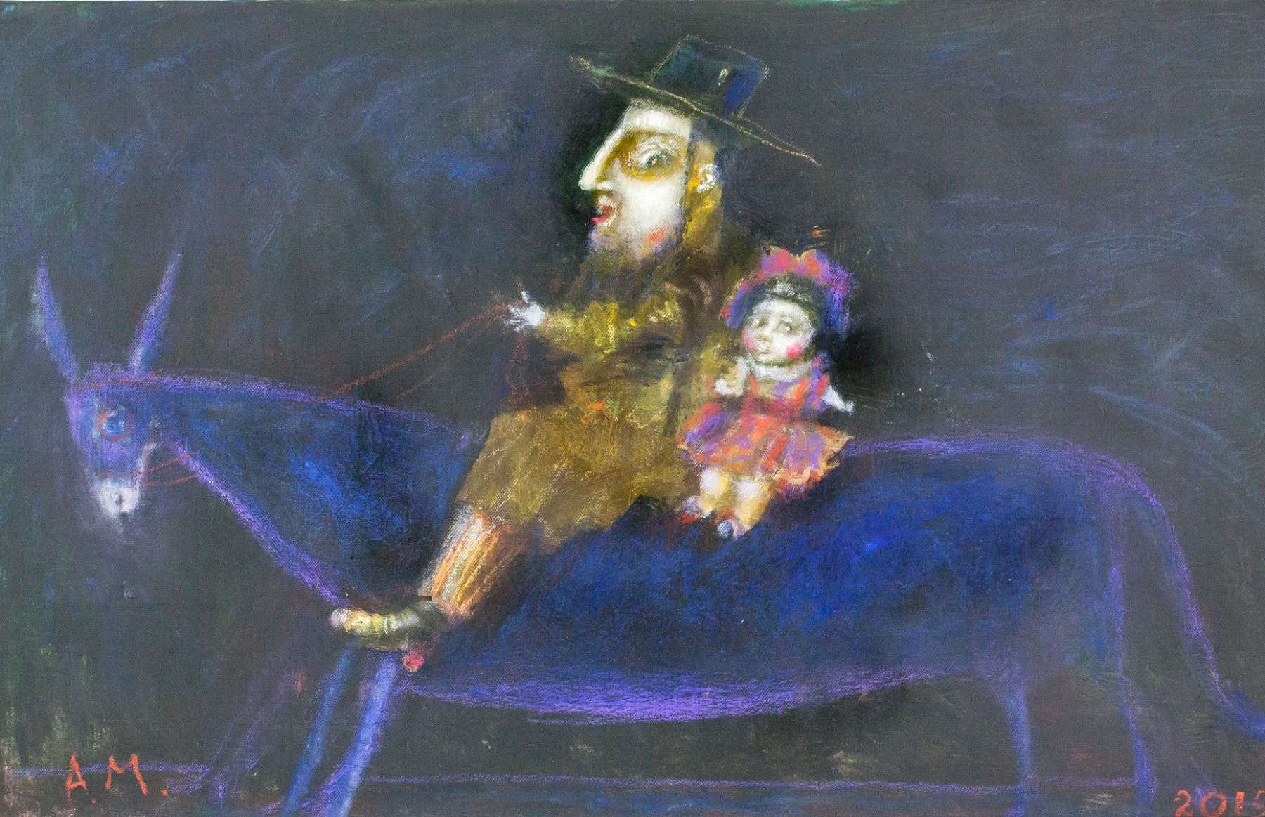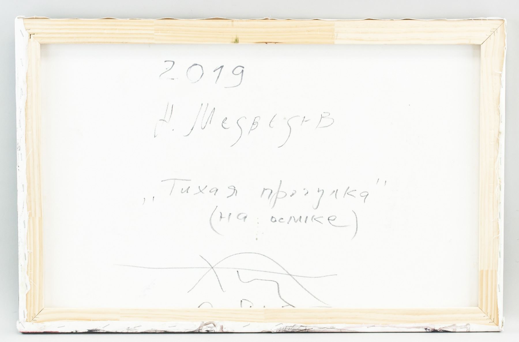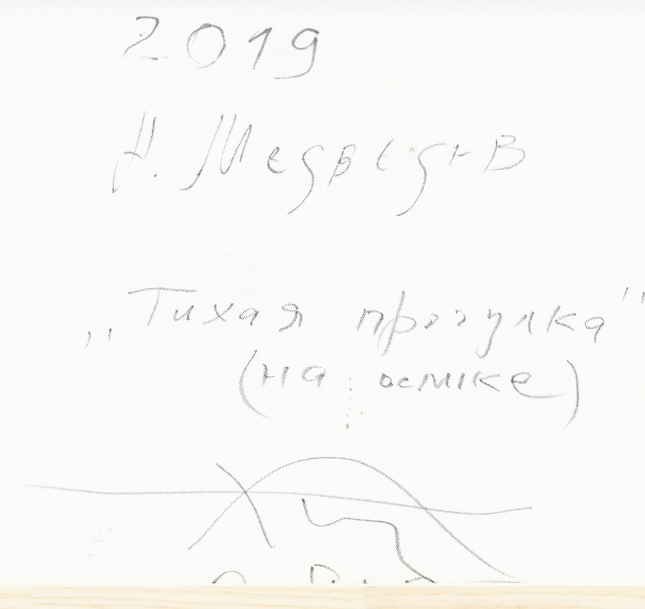 Oil on canvas. Featuring a portrait scene. Entitled, "Silent Walk On the Donkey". Signed by Andrei Medvedev (1960-, Russian) and dated 2019 on the lower left corner. Inscribed with artist's signature, title, date, and dimensions on verso. 48 x 75 cm (19 x 29.5 in). Andrei Medvedev has had several gallery and museum exhibitions, including at the Ludwig Museum of Contemporary Art. Several works by the artist have been sold at auction, including 'Ladoga-2M' sold at Vladey 'Spring Auction' in 2015 for $14,467. “The space which he creates seems to be devoid of gravity, giving the impression that the individuals portrayed are floating above the ground. His compositions, the positions of his figures and the apparent lack of gravity provide his work with a mystery all of its own. The imperfections and strange juxtapositions summon up questions about our existence and the absurdity of life, but likewise the beauty of the glaring contrasts of the 21st century” Peter Van Rooy (German professor and art critic). Provenance: Acquired from the artist.
