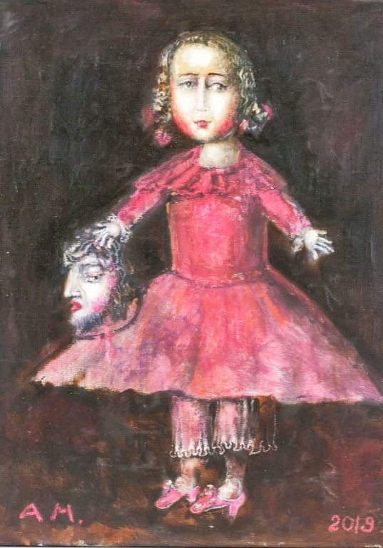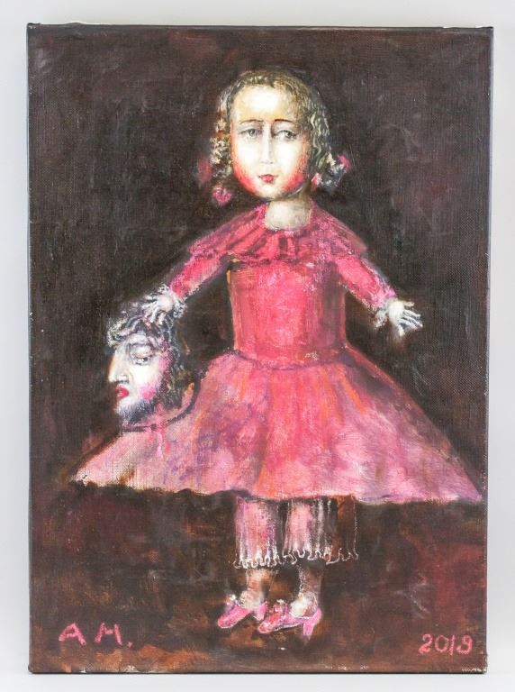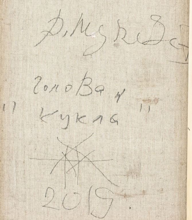 Oil on canvas. Featuring a portrait scene. Entitled, "A head and a doll". Signed by Andrei Medvedev (1960-, Russian) and dated 2019 on the lower left corner. Inscribed with artist's signature, title, date, and dimensions on verso. 71 x 51 cm (28 x 20 in). Andrei Medvedev has had several gallery and museum exhibitions, including at the Ludwig Museum of Contemporary Art. Several works by the artist have been sold at auction, including 'Ladoga-2M' sold at Vladey 'Spring Auction' in 2015 for $14,467. “The space which he creates seems to be devoid of gravity, giving the impression that the individuals portrayed are floating above the ground. His compositions, the positions of his figures and the apparent lack of gravity provide his work with a mystery all of its own. The imperfections and strange juxtapositions summon up questions about our existence and the absurdity of life, but likewise the beauty of the glaring contrasts of the 21st century” Peter Van Rooy (German professor and art critic). Provenance: Acquired from the artist.