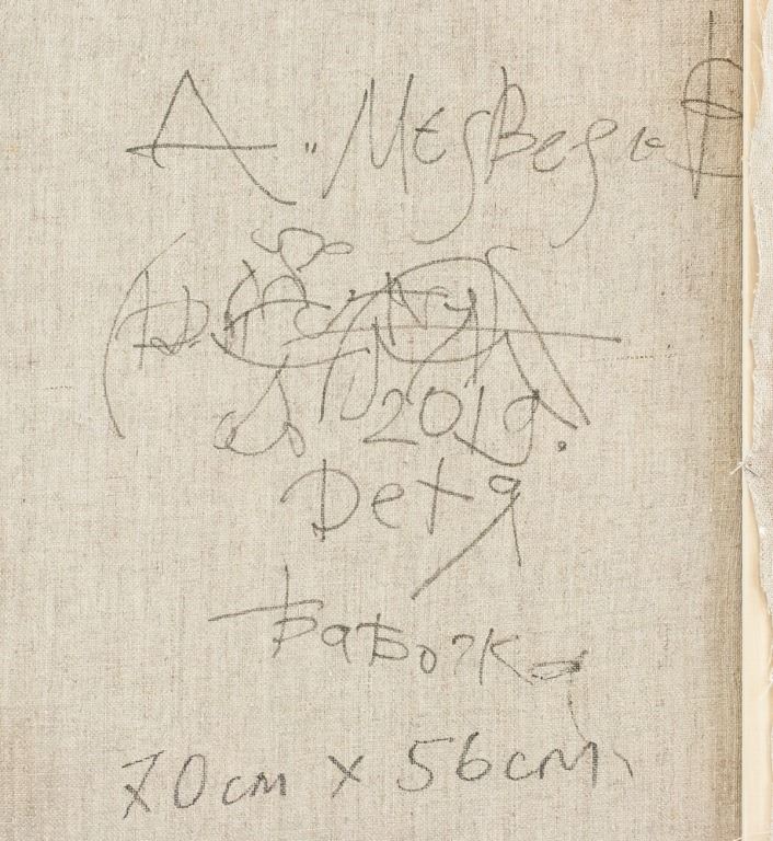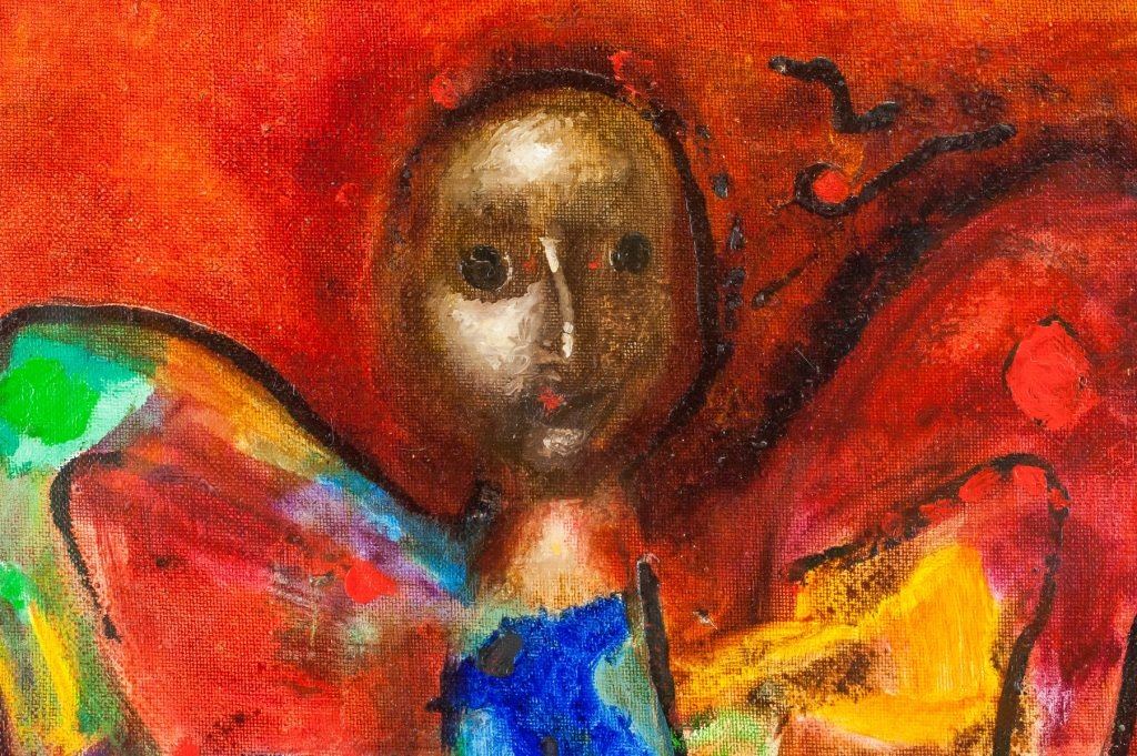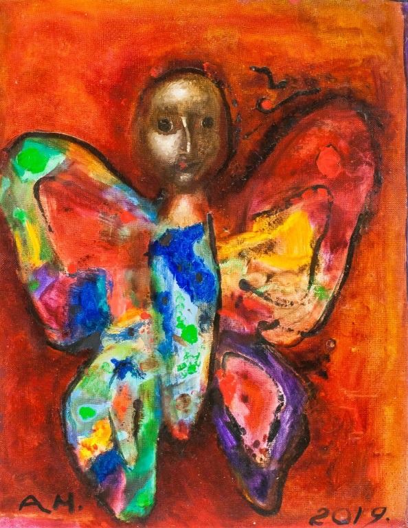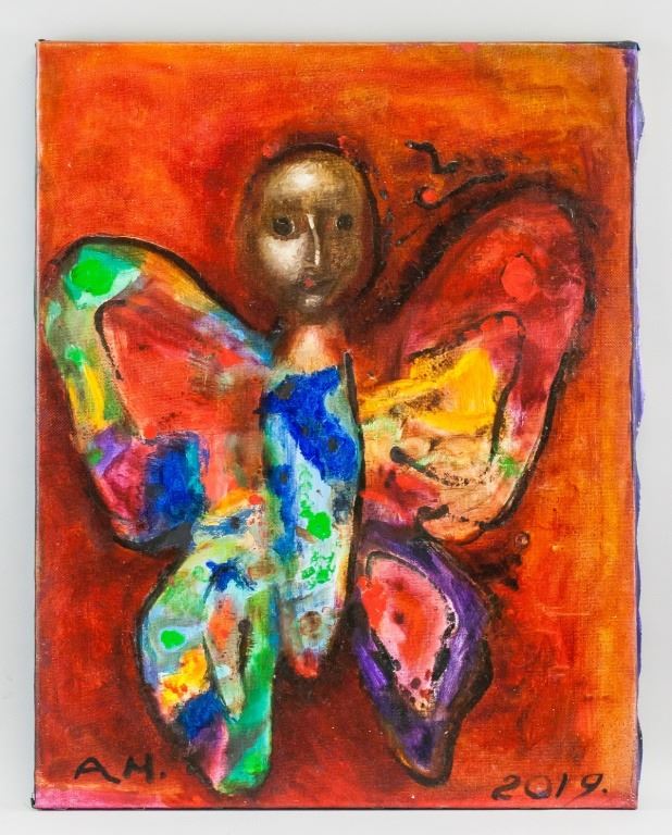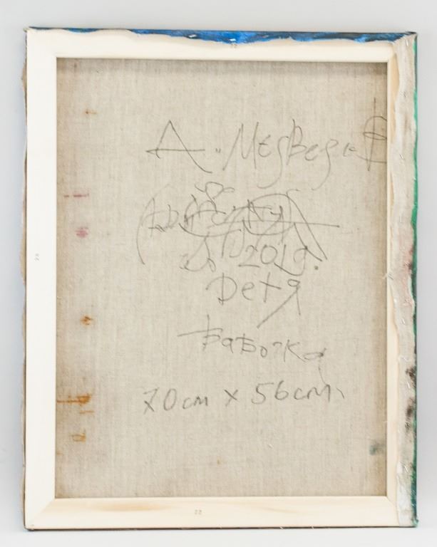 Oil on canvas. Featuring a portrait. Entitled, "Child Butterfly". Signed by Andrei Medvedev (born 1960, Russian) and dated 2019 on the lower left and lower right corner, respectively. Verso signed with artist's signature with title. 72 x 56 cm (28.25 x 22 in). PROVENANCE: Acquired from the artist.