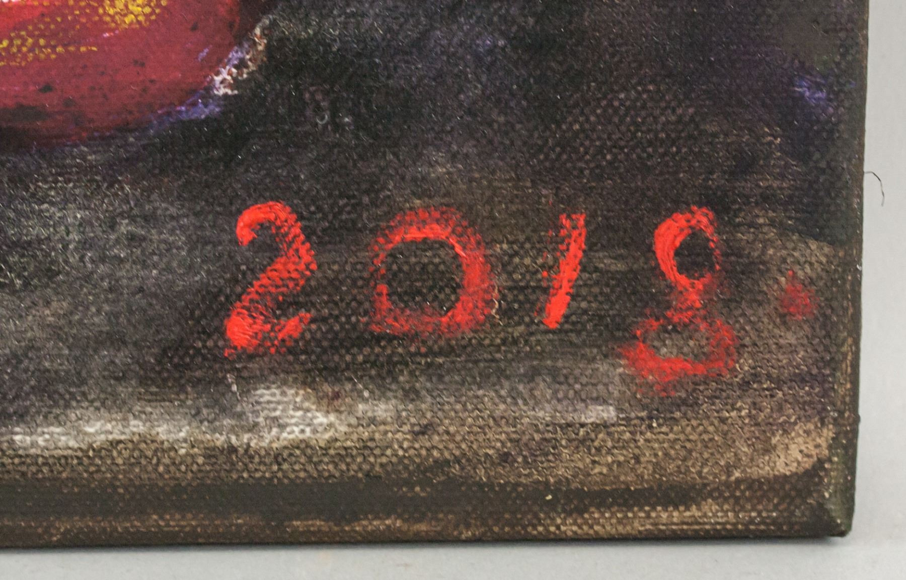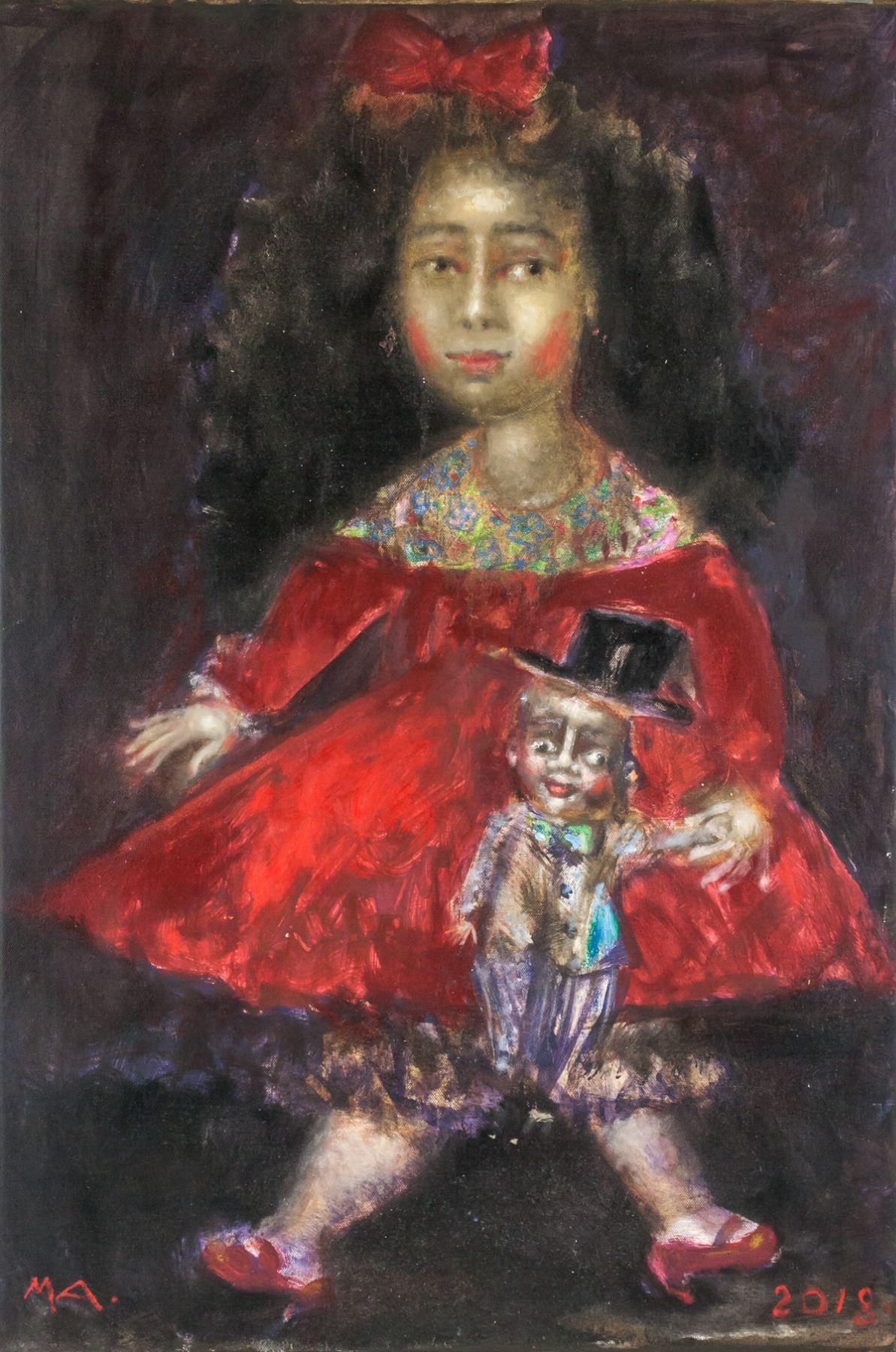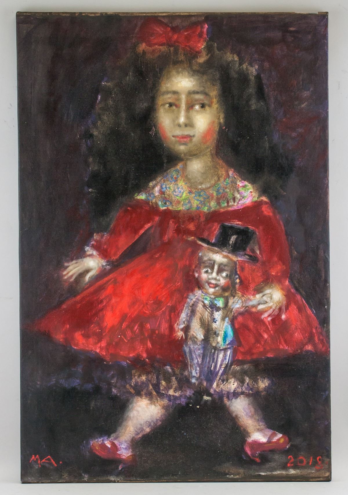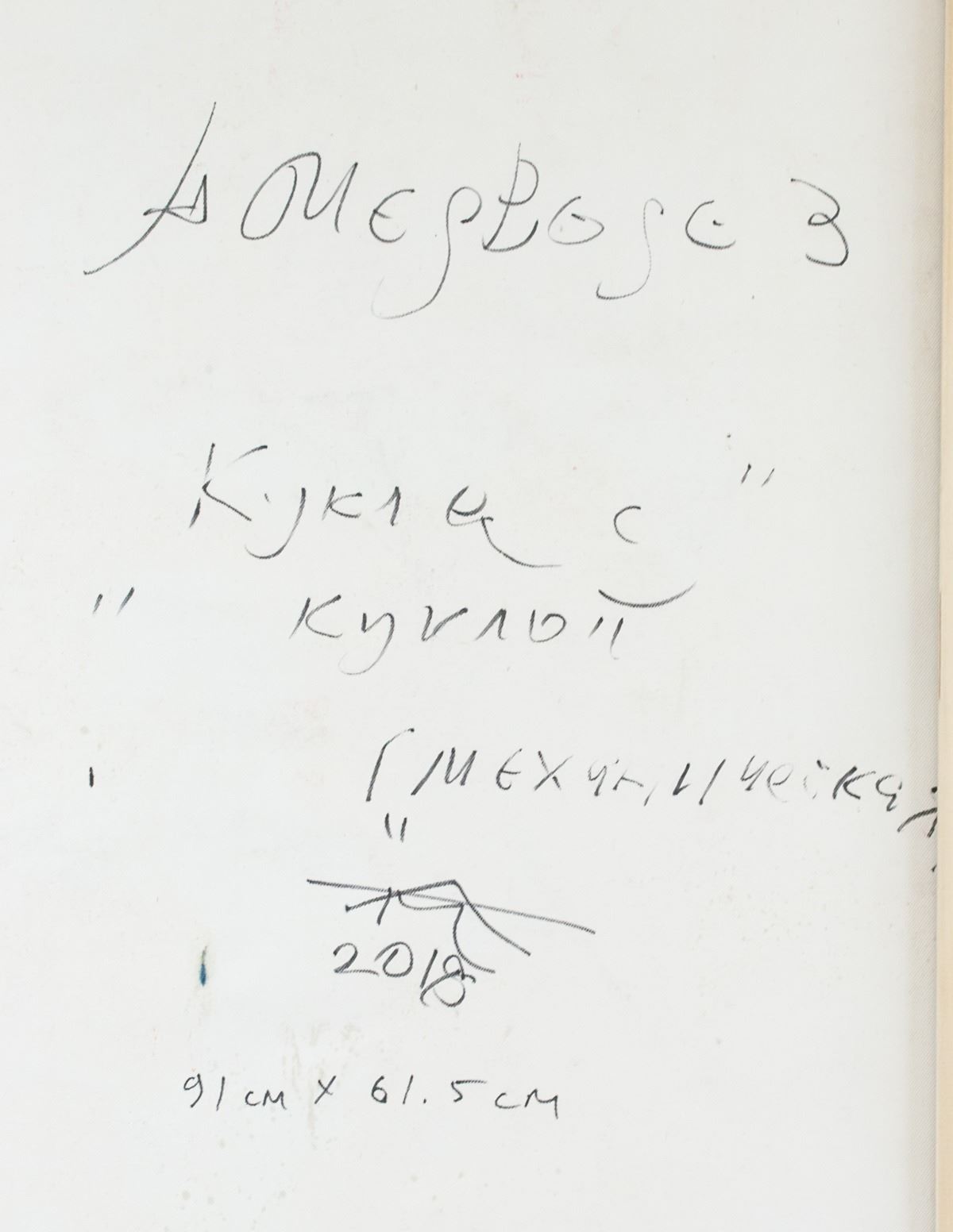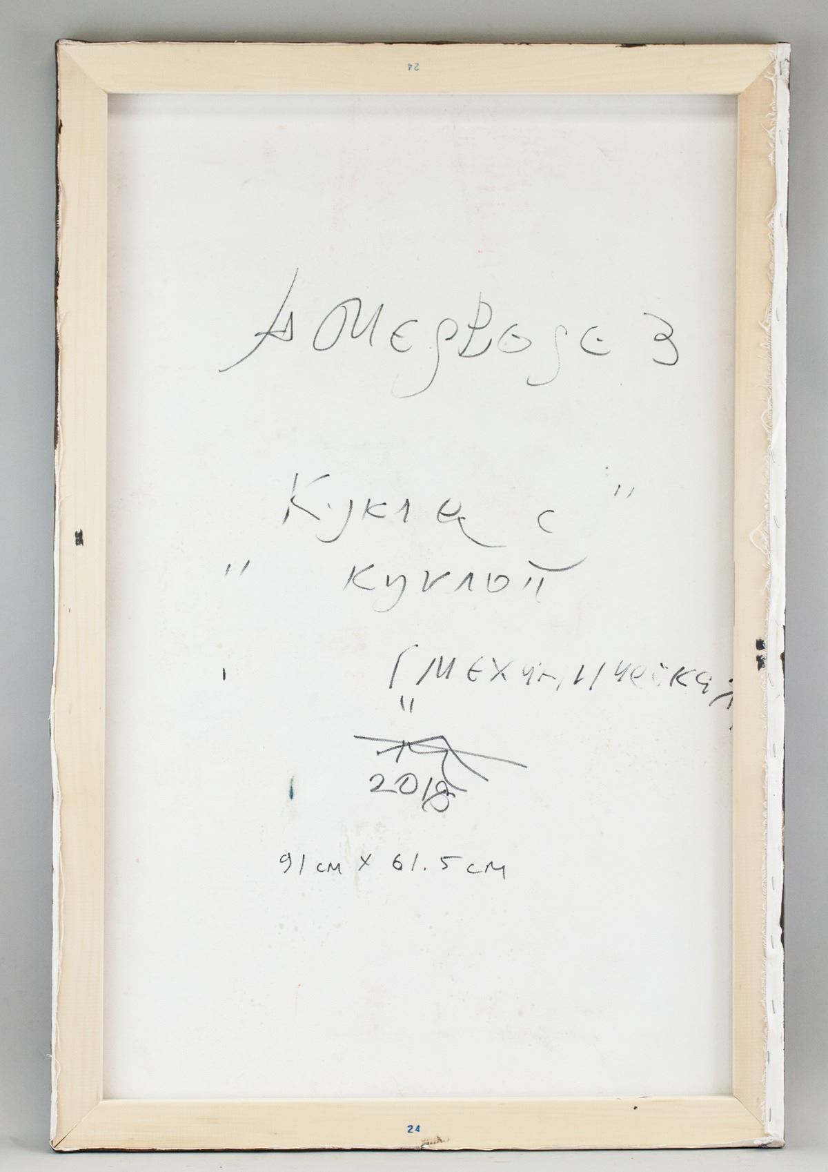 Oil on canvas. Featuring a portrait. Entitled, "Doll with Mechanical Doll." Signed by Andrei Medvedev (born 1960, Russian) and dated 2018. Inscribed with title, artist's name, date, and dimensions on verso. 91 x 61.5 cm (35.8 x 24.2 inches). Andrei Medvedev has had several gallery and museum exhibitions, including at the Ludwig Museum of Contemporary Art. Several works by the artist have been sold at auction, including 'Ladoga-2M' sold at Vladey 'Spring Auction' in 2015 for $14,467. “The space which he creates seems to be devoid of gravity, giving the impression that the individuals portrayed are floating above the ground. His compositions, the positions of his figures and the apparent lack of gravity provide his work with a mystery all of its own. The imperfections and strange juxtapositions summon up questions about our existence and the absurdity of life, but likewise the beauty of the glaring contrasts of the 21st century”Peter Van Rooy (German professor and art critic). PROVENANCE: Acquired from the artist.
