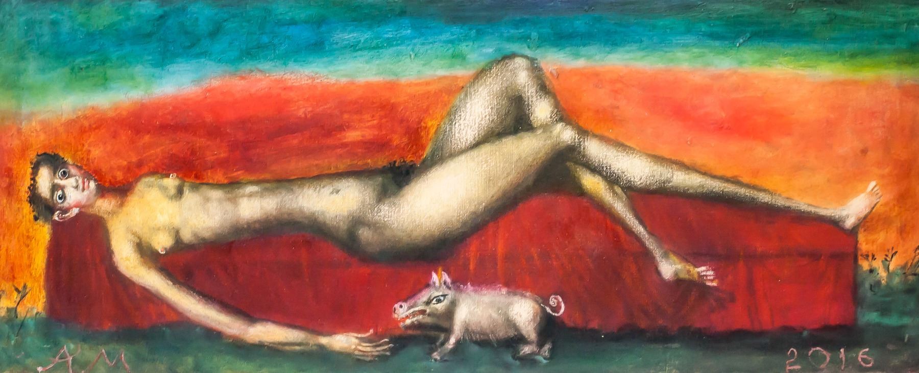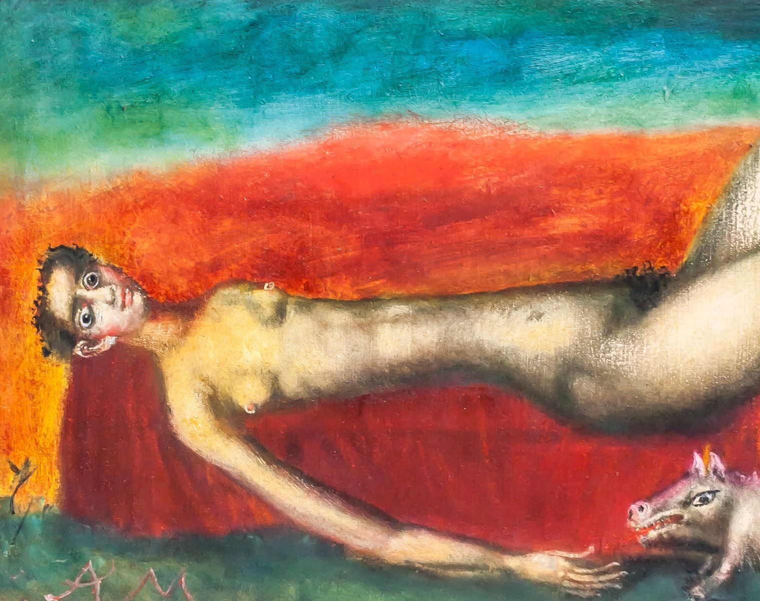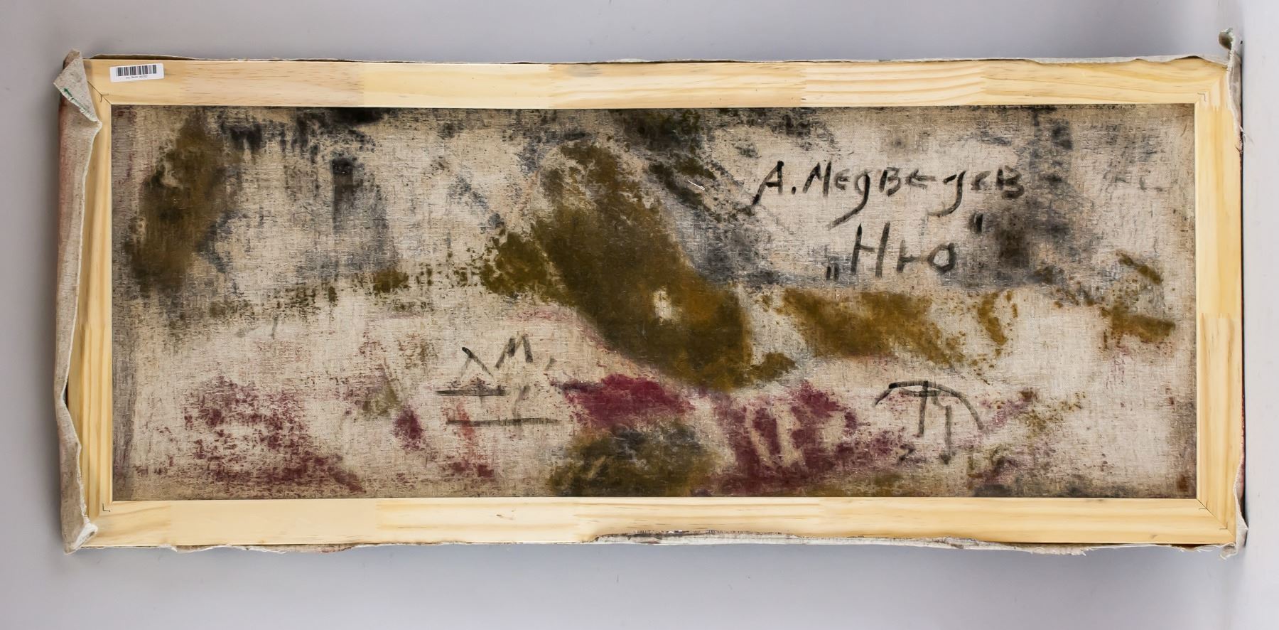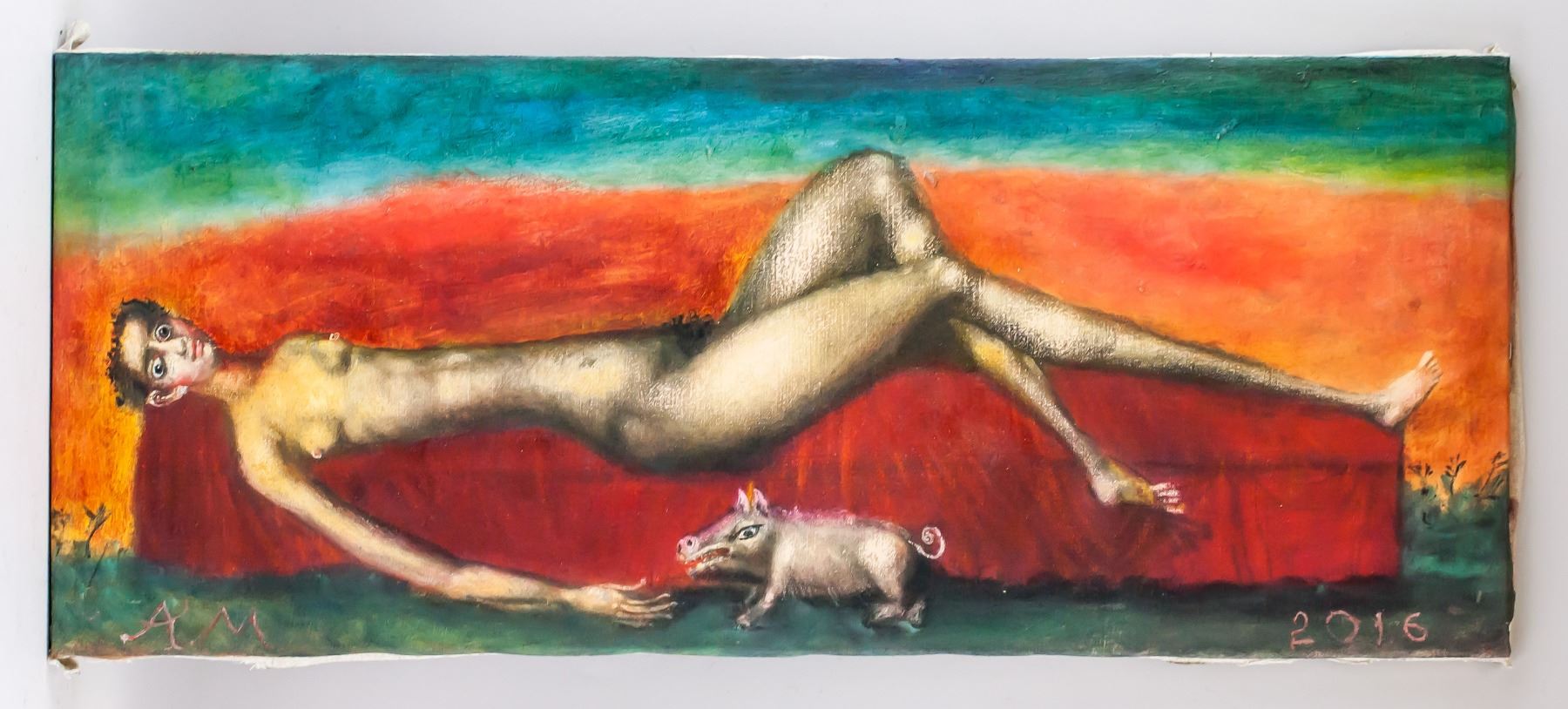 Oil on canvas. Featuring a nude. SIgned AM on the lower left corner and inscribed 2016 on the lower right corner. Signed in Cyrllic in ink A. Medvedev on verso. Attributed to Andrei Medvedev (Born 1960, Russian). 40.5 x 98 cm (15.9 x 38.6 inches). PROVENANCE: Acquired from the artist
