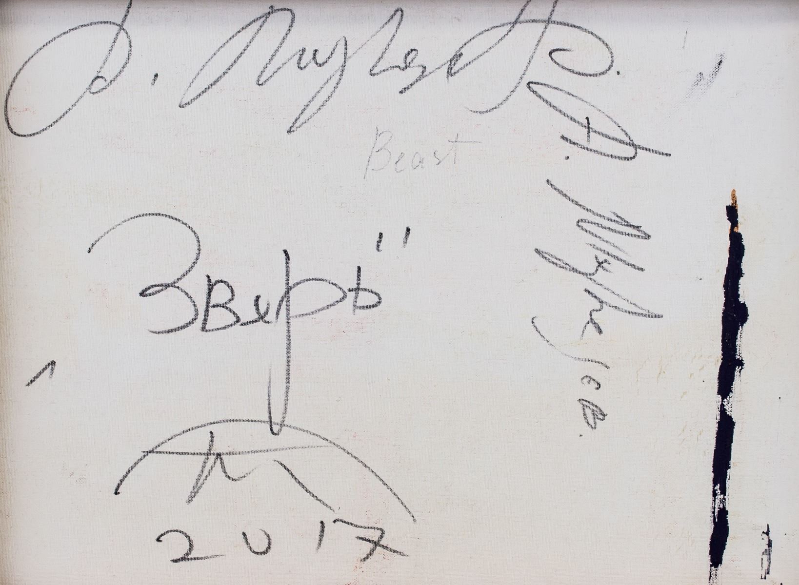 Oil on canvas. Featuring a surrealist landscape scene with figure and beast. Signed by Andrei Medvedev and dated 2012 on the lower left and lower right corner, respectively. Entitled, "Beast," with artist's name, dimensions, medium inscribed on verso. 45.5 x 61 cm (17.75 x 24 inches). PROVENANCE: Acquired from the artist. Andrey Medvedev has had several gallery and museum exhibitions, including at the Ludwig Museum of Contemporary Art. Several works by the artist have been sold at auction, including 'Ladoga-2M' sold at Vladey 'Spring Auction' in 2015 for $14,467. “The space which he creates seems to be devoid of gravity, giving the impression that the individuals portrayed are floating above the ground. His compositions, the positions of his figures and the apparent lack of gravity provide his work with a mystery all of its own. The imperfections and strange juxtapositions summon up questions about our existence and the absurdity of life, but likewise the beauty of the glaring contrasts of the 21st century” Peter Van Rooy (German professor and art critic).