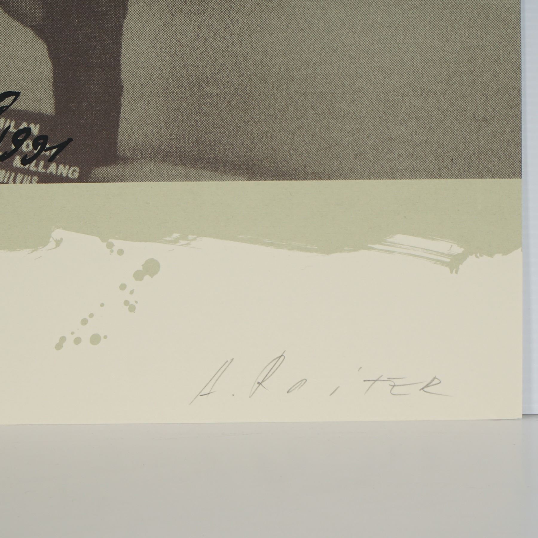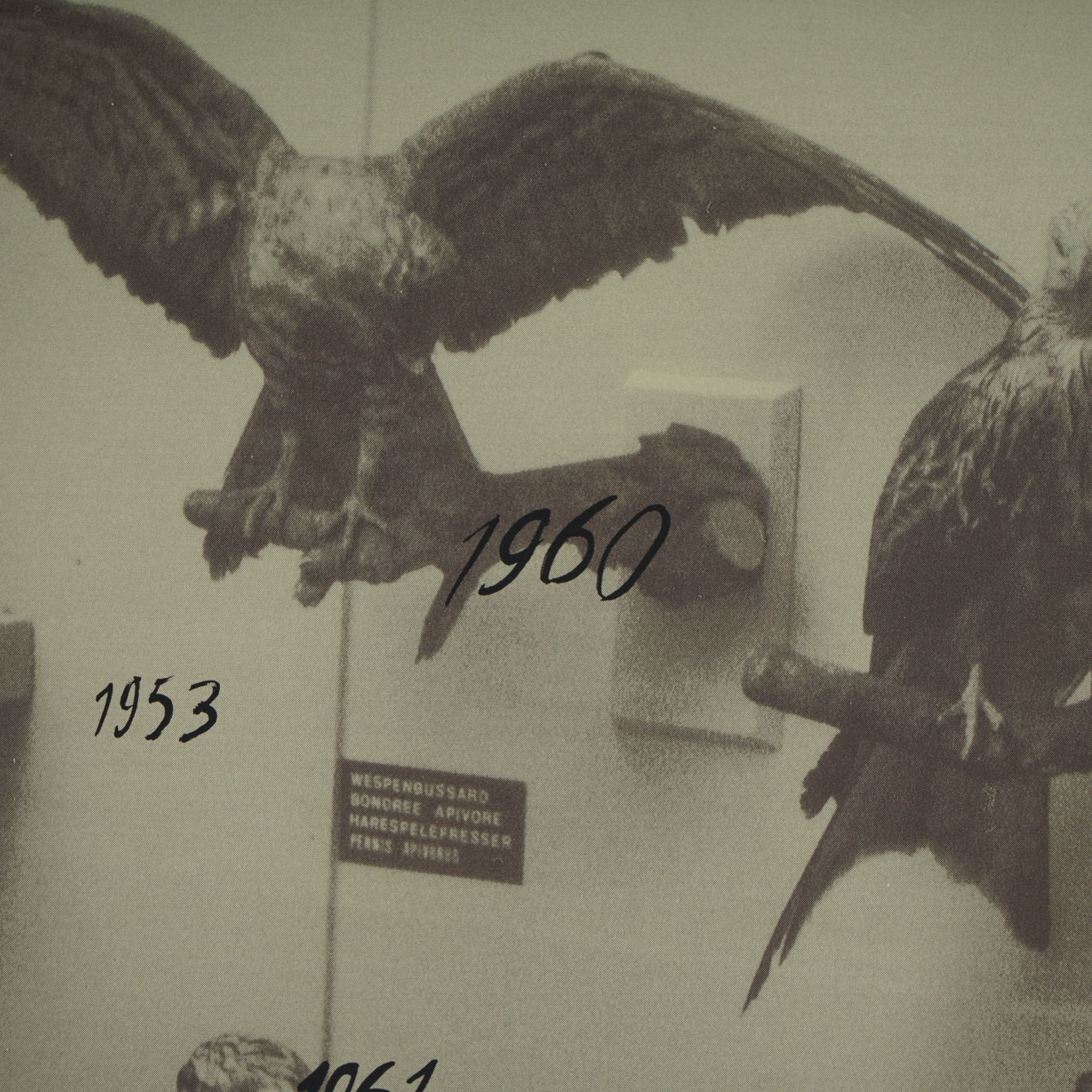 Limited edition serigraph by German-Russian artist Andrei Roiter, featuring a monochromatic image of mounted raptors in a museum setting. Overlaid with bold handwritten dates ranging from 1917 to 1991, the piece invites reflection on historical cycles, memory, and natural history. Andrei Roiter is a German-Russian contemporary artist known for his mixed media works that explore the intersections of memory, natural history, and socio-political commentary. With a career shaped by his experiences in post-war Eastern Europe and later Germany, Roiter's practice often incorporates archival imagery and symbolic references. He has collaborated with several international environmental organizations and exhibited widely across Europe. This work is from a special Printer's Proof edition, marked PP 1/15 in the lower left, and signed by the artist in pencil on the lower right. It is accompanied by a printed folio cover from Edition Domberger and Artists United for Nature e.V., underscoring its origin within a curated series of environmentally conscious artworks. Printed on heavyweight paper with deckled lower edge, this conceptual piece blends photographic realism with temporal commentary, integrating themes of conservation, extinction, and memory.