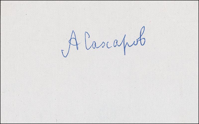 Eminent Soviet nuclear physicist, dissident and human rights activist (1921-1989). He was an advocate of civil liberties and reforms in the Soviet Union and was awarded the Nobel Peace Prize in 1975. Ballpoint Cyrillic signature on an off-white 4.25 x 2.5 card. In very good condition, with several creases, with a couple of the creases passing through signature. Consignor notes signature was obtained in the spring of 1989 at Phillips Academy in Andover, Massachusetts after a lecture.