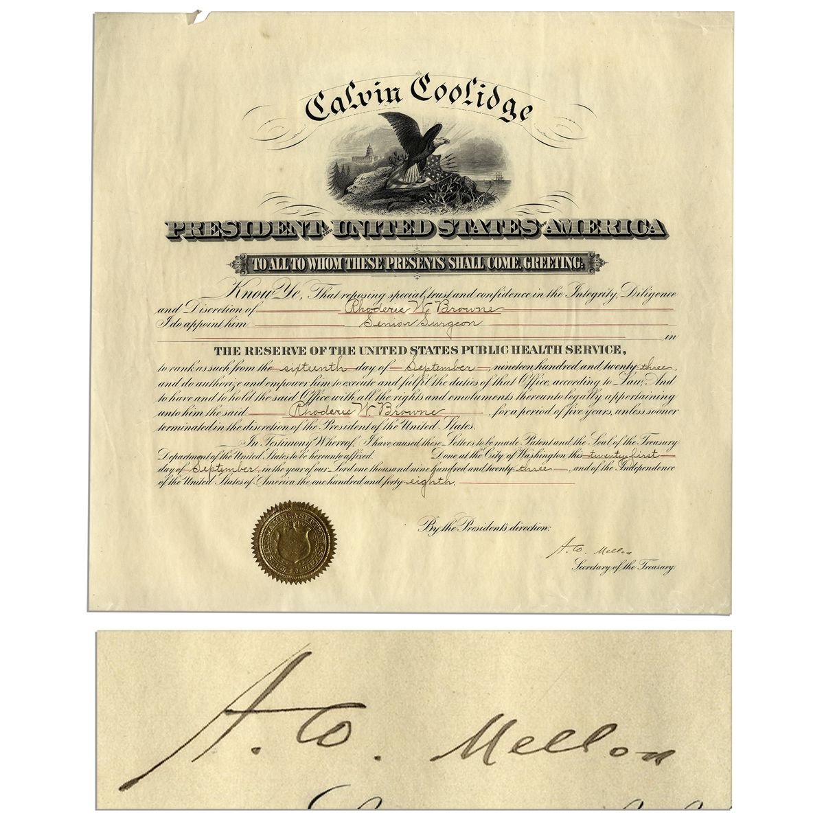 Andrew Mellon document signed as Secretary of the Treasury, dated 21 September 1923. Partially printed
