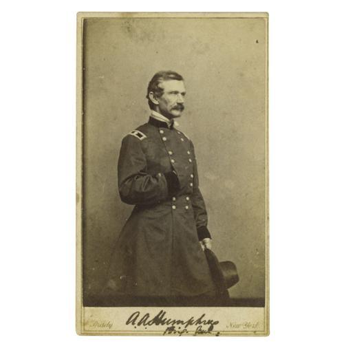 <B>Andrew A. Humphreys Signed CDV,</B></I> “<I>A.A. Humphreys Brig.Genl.</B></I>”, Brady's Galleries, New York & Washington, D.C. backmark. A standing ¾ figure portrait of the general. Bold, dark signature in lower margin. Excellent tonal contrasts. Fine condition. A. A. Humphreys (1810 - 1883) was a career soldier, graduating from West Point in 1831. An engineer by training and experience, he served variously as a divisional commander at Gettysburg, as Meade's chief of staff and as commander of the 2nd Corp during the war's final months in Virginia. In 1866 Humphreys was promoted to brigadier general in the Regular Army and became its Chief Engineer.<BR><BR><b>Shipping:</b> Miscellaneous Collectibles, Smal (<a target="_blank" href="http://www.heritageauctions.com/common/shipping.php">view shipping information</a>)