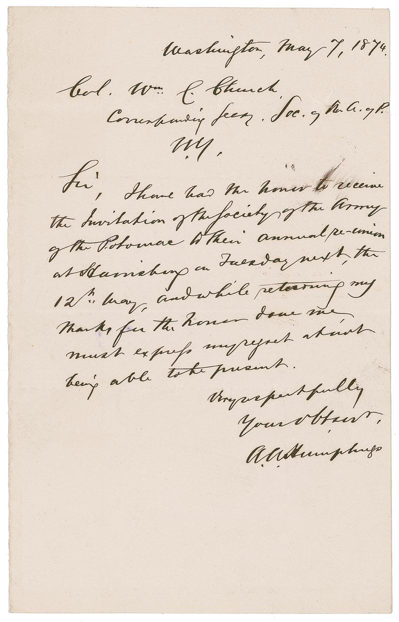 Union General (1810-1883) and Chief Engineer of the US Army. ALS signed “A. A. Humphreys,” one page, 4.5 x 7, May 7, 1874. Letter to William Conant Church. In part: “I have had the honor to receive the invitation of the Society of the Army of the Potomac to their annual re-union…and while returning my thanks for the honor done me, must express my regret about [not] being able to be present.” In fine condition, with scattered light wrinkling and creasing, slightly affecting signature.