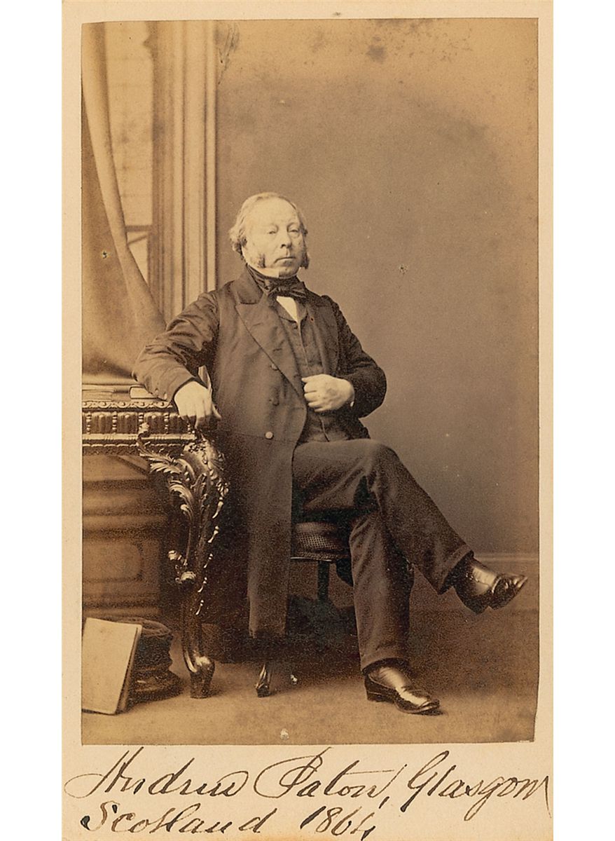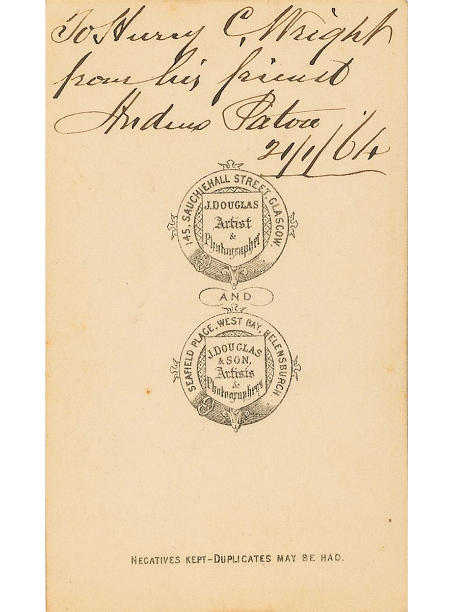 English writer. Original 2.5 x 4.25 carte-de-visite photo by J. Douglas of Glasgow, signed in the lower border in black ink, “Andrew Paton, Glasgow, Scotland 1864,” and also signed and inscribed on the reverse, “To Henry C. Wright from his friend Andrew Paton 21/1/64.” In fine condition, with some scattered light silvering and some mild rippling to image.