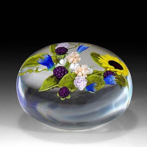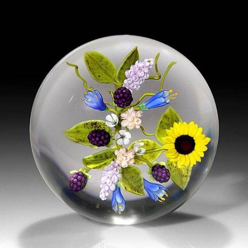 Andrew Byers 2004 sunflower, lilacs, and berries bouquet paperweight. The piece contains a brown-centered yellow sunflower, sprays of pale lavender lilacs, dark purple berries, blue bellflowers, small white flowers, clusters of small pink flowers, green leaves, and tendrils, on clear ground. Signature cane. Signed/dated 2004. Edition number 4 of 10. Diameter 3 1/4".