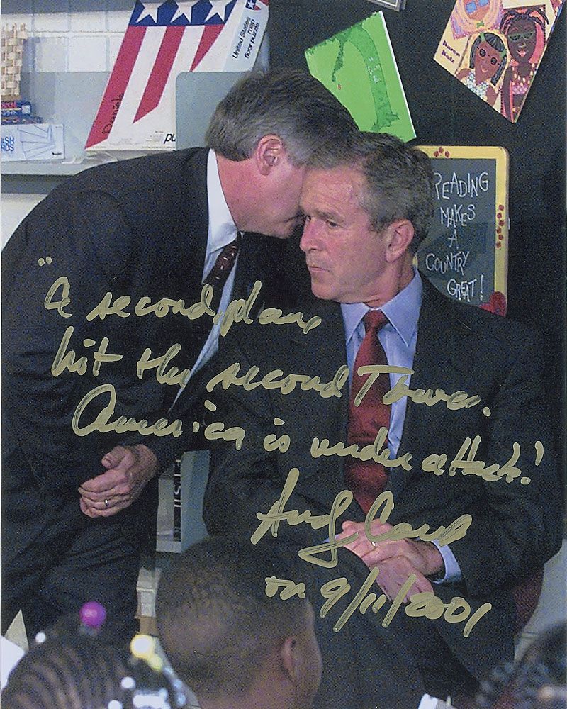 Color satin-finish 8 x 10 photo of Card speaking to President Bush on the morning of 9/11, signed in gold ink, “‘A second plane hit the second Tower. America is under attack!’ Andy Card on 9/11/2001.” In very fine condition.