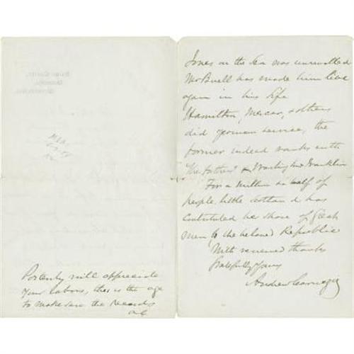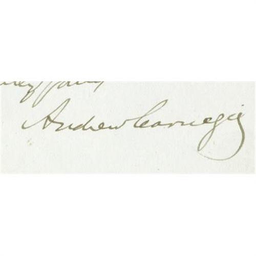 <B>Andrew Carnegie Autograph Letter Signed in full, "</B></I><I>Andrew Carnegie" and initialed, "A C".</B></I> Two pages, 5" x 8", on Bonar Bridge Station, Clashmore Telegram letterhead, Skibo Castle, Dornoch, Sutherland, Scotland, August 12, 1905 to Mr. Kenkle reflecting on the significant role the Scots played in America towards the establishment of the Republic: "<I>...The Scottish element in Revolutionary History is great. I suppose John Witherspoon was really of the Most service holding up the banner of the Republic at the Critical Moment - John Paul Jones on the Sea was unrivalled. Mr. Buell has made him life again in his life. Hamilton, Mercer, & others did yeomen service, the former indeed ranks with 'the Father' & Washington & Franklin. For a million & a half of people, little Scotland has contributed her share of great Men to the beloved Republic...</B></I>" Fine condition. <I>Ex. Henry E. Luhrs Collection.</B></I><BR><BR><BR><b>Shipping:</b> Flat Material, Small (<a target="_blank" href="http://www.heritageauctions.com/common/shipping.php">view shipping information</a>)
