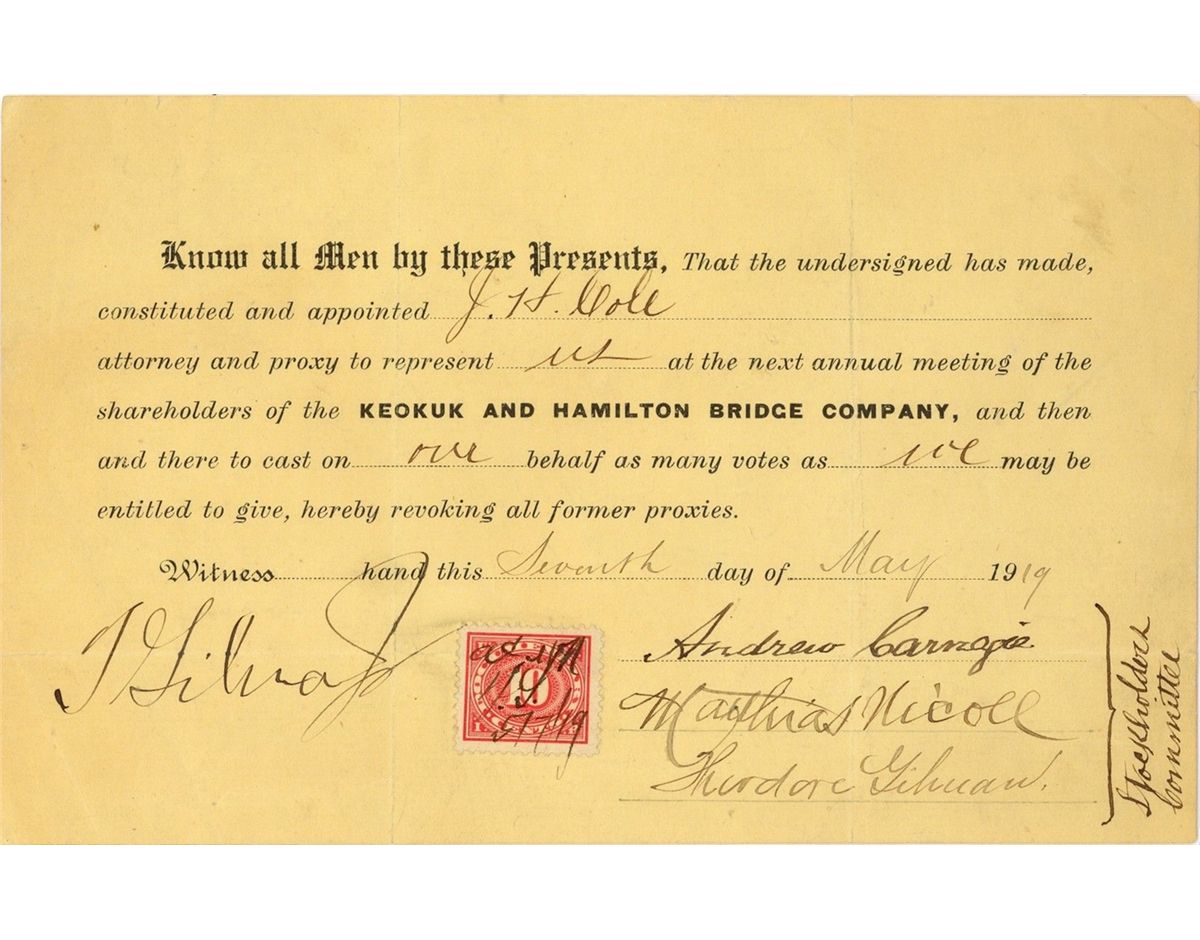 KEOKUK AND HAMILTON BRIDGE COMPANY PROXY CARD FOR SHAREHOLDERS MEETING, SIGNED BY ANDREW CARNEGIE AND OTHERS (STOCKHOLDER COMMITTEE), DATED MAY 7, 1919. Andrew Carnegie (1835 - 1919) Scottish-American industrialist who led the enormous expansion of the American steel industry in the late 19th Century. He was also one of the highest profile philanthropists of his era; his 1889 article proclaiming "The Gospel of Wealth" called on the rich to use their wealth to improve society, and stimulated a wave of philanthropy. Printed document completed in manuscript, power of Attorney appointment to J.H. Cole Attorney for the shareholders of the Keokuk and Hamilton Bridge co. signed Andrew Carnegie and dated 7, May 1919.