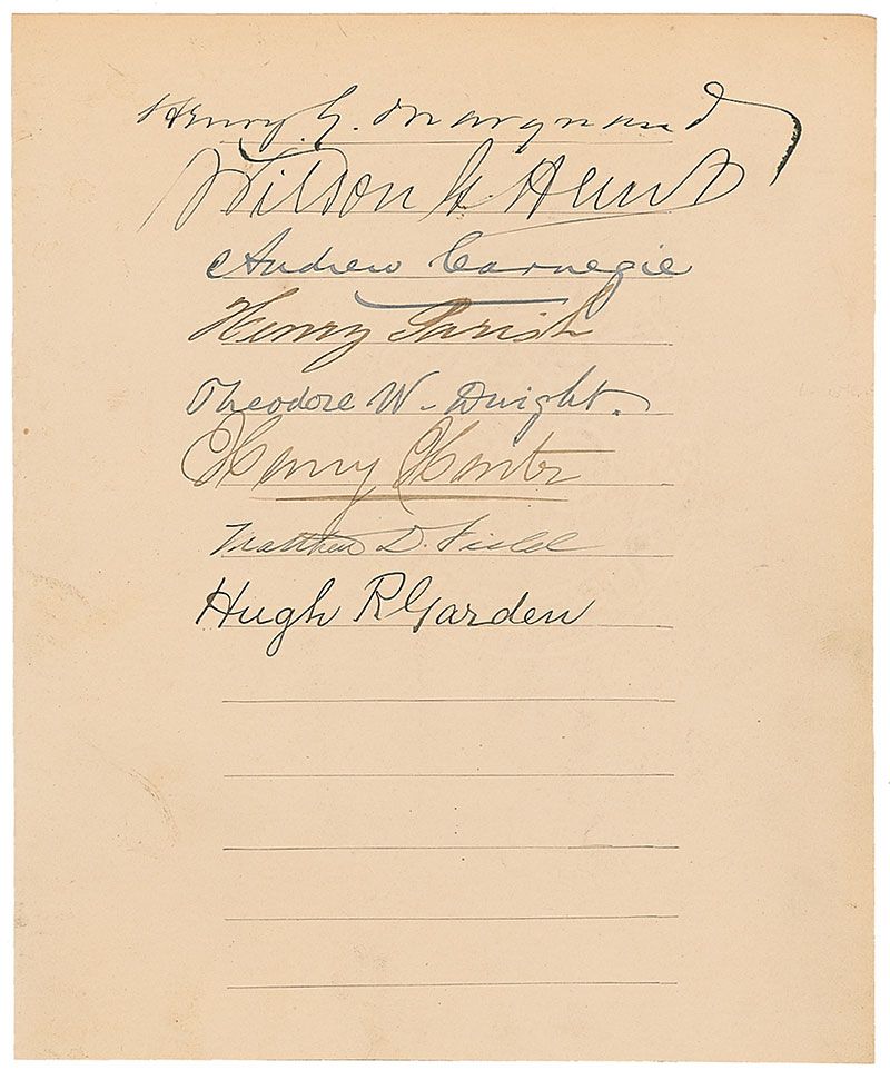 Vintage ink signature, “Andrew Carnegie,” on an off-white 7 x 8.75 sheet from a guest book. Also signed by Henry G. Marquand (financier and art collector), Wilson G. Hunt (financier who promoted the transatlantic telegraph cable), Theodore W. Dwight (jurist and educator), Henry Parish (president of New York Life), Matthew D. Field (civil engineer and pioneer of the suspension bridge), and Hugh R. Garden (Democratic powerbroker). In fine condition.