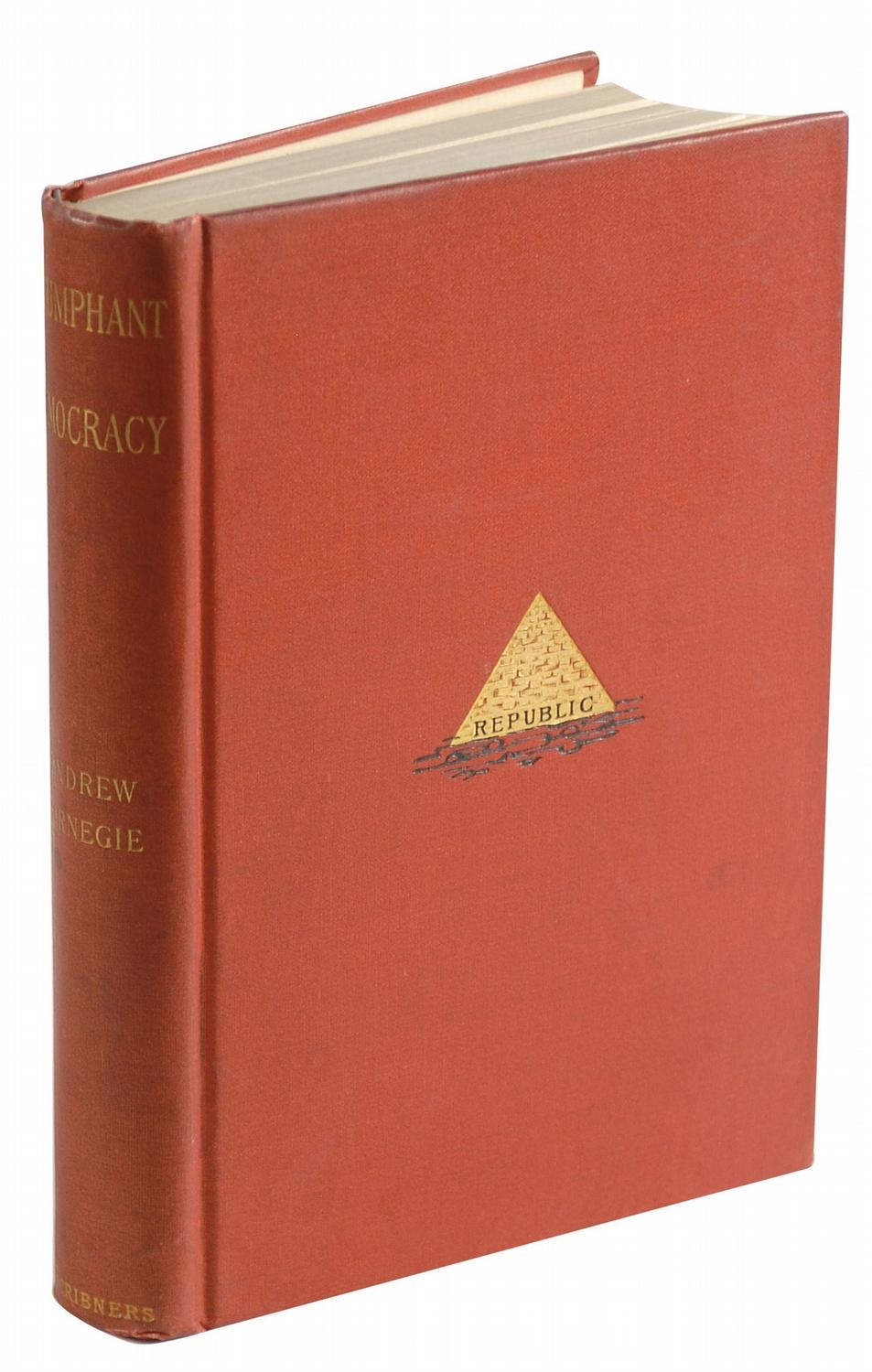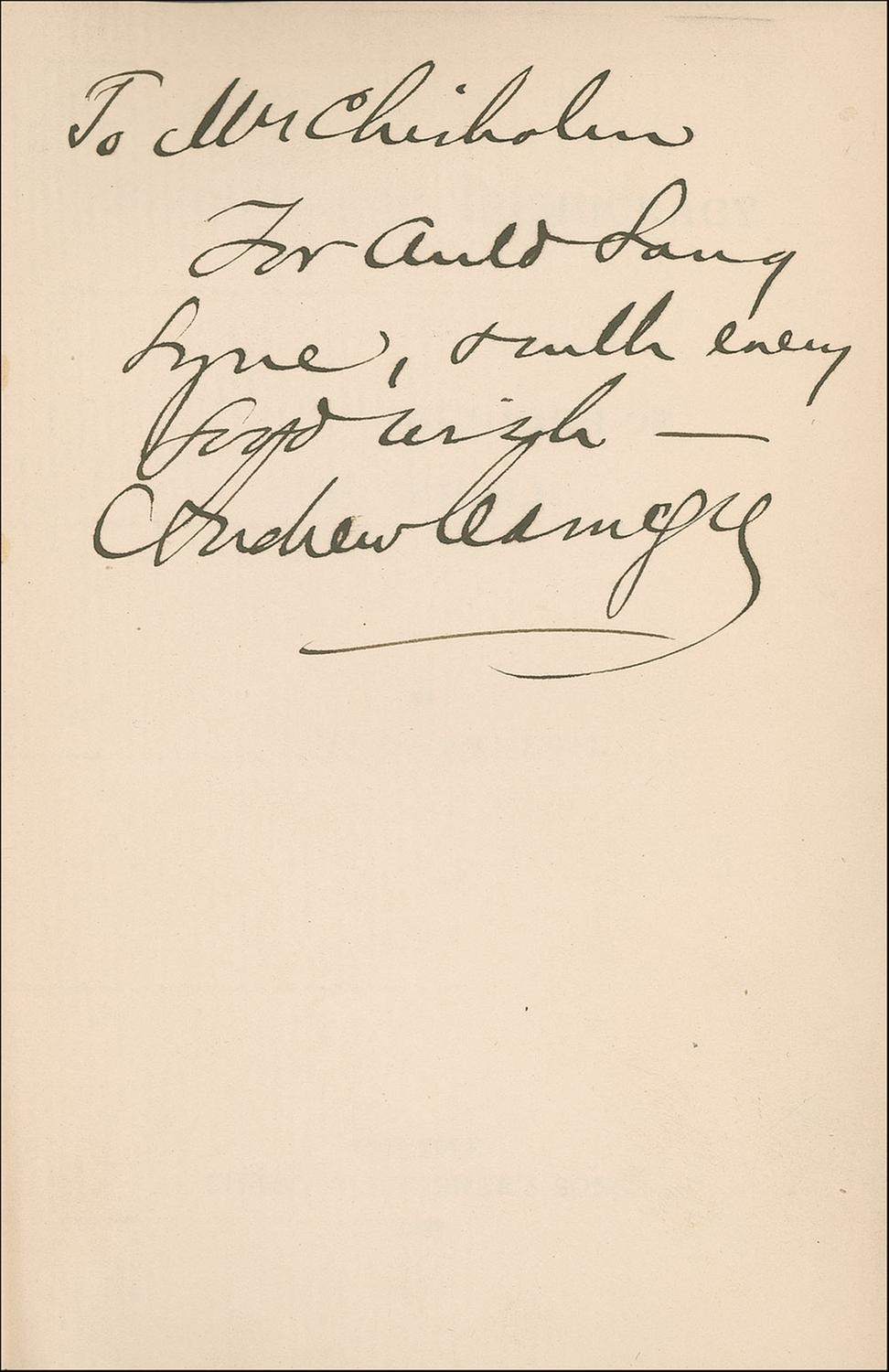 Signed book: Triumphant Democracy. Later printing. NY: Charles Scribner's Sons, 1888. Hardcover, 5.5 x 7.5, 519 pages. Signed and inscribed on the second free end page, “To Mr. Chisolm, For Auld Lang Syne & with every good wish, Andrew Carnegie.” Light mirroring of signature on preceding and following page, and some scattered light wear and soiling to covers and spine, otherwise fine condition.