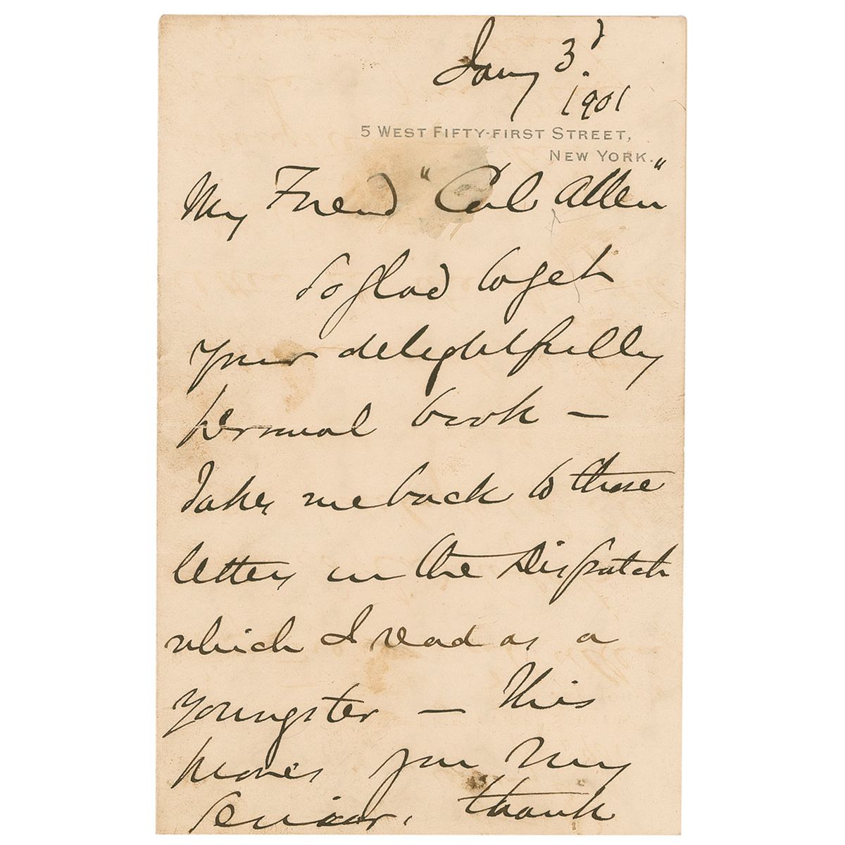 ALS, three pages on two adjoining sheets, 3.75 x 6, personal letterhead, January 3, 1901. Letter to Colonel Edward Jay Allen, organizer of the Pacific and Atlantic Telegraph Company. In full: “So glad to get your delightfully personal book—Takes me back to those letters in the Dispatch which I read as a youngster. This leaves you very senior, thank the Fates for that! Your preface is a gem—shows the literary gift & I'll take up the volume at night & go over it I'm sure with rare pleasure, one which only the few ‘far heu’ [?] friends of lang syne can feel. Glad to think of you as still the old happy genial man in his prime. Many happy New Years to you [and] to that little woman you prize.” In very good condition, with Carnegie’s closing, written vertically, affecting a few letters of text, uniform toning, some heavier spotting to first page, and a bit of trivial feathering to signature. Allen was a personal friend of Abraham Lincoln and a member of the staff of General Fremont during the Civil War. One of the first settlers of Seattle, he organized the Pacific and Atlantic Telegraph company and was a dear friend of Carnegie.