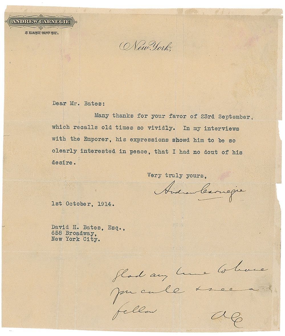TLS, one page, 7.75 x 9, personal letterhead, October 1, 1914. Letter to David Bates. In full: “Many thanks for your favor of 23rd September, which recalls old times so vividly. In my interviews with the Emperor, his expressions showed him to be so clearly interested in peace, that I had no doubt of his desire.” At the bottom, Carnegie adds a brief handwritten postscript, “Glad any time to have you call & see a fellow. AC.” In very good condition, with intersecting folds, two passing through single letters of signature, slightly trimmed edges, a bit of paper loss to edges, and a bit of scattered light soiling. Carnegie was an early activist for peace in Europe and sought to ease tension in the region by using his money and influence, including attempting to get President Roosevelt to visit the country.