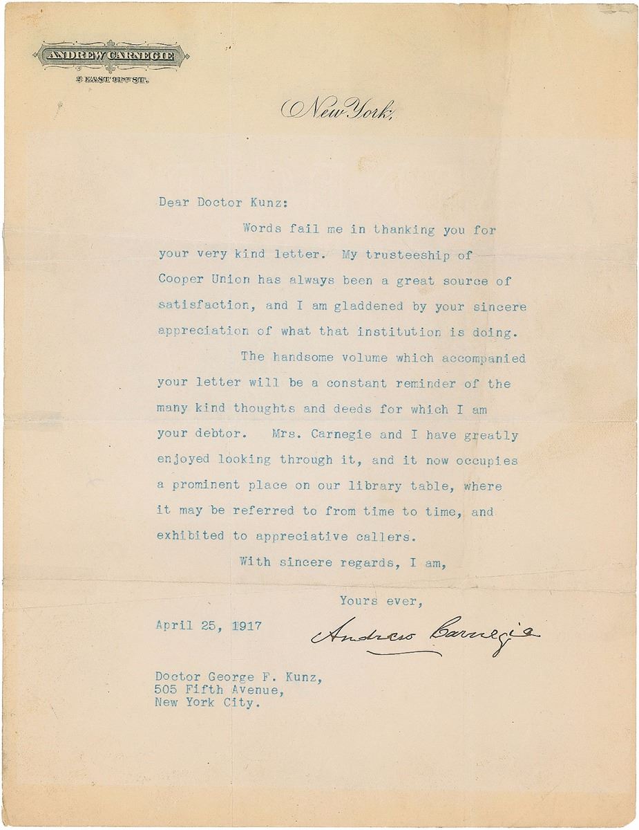 TLS, one page, 8.25 x 10.75, personal letterhead, April 25, 1917. Letter to esteemed mineralogist Dr. George F. Kunz, in full: “Words fail me in thanking you for your very kind letter. My trusteeship of Cooper Union has always been a great source of satisfaction, and I am gladdened by your sincere appreciation of what that institution is doing. The handsome volume which accompanied your letter will be a constant reminder of the many kind thoughts and deeds for which I am your debtor. Mrs. Carnegie and I have greatly enjoyed looking through it, and it now occupies a prominent place on our library table, where it may be referred to from time to time, and exhibited to appreciative callers.” In very good condition, with tape-repaired tears to intersecting folds (one vertical fold passing through a single letter of the signature), irregular toning to borders, slight creasing, small tears to edges, and tack holes to upper left corner.