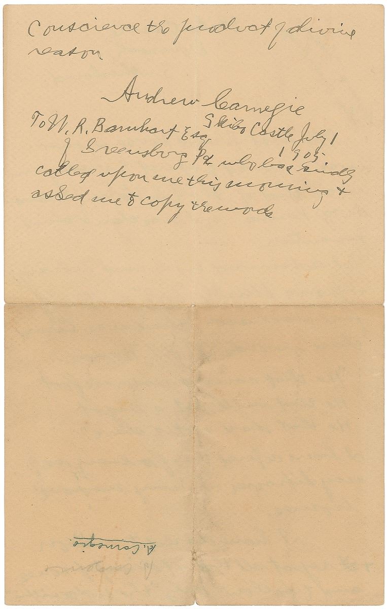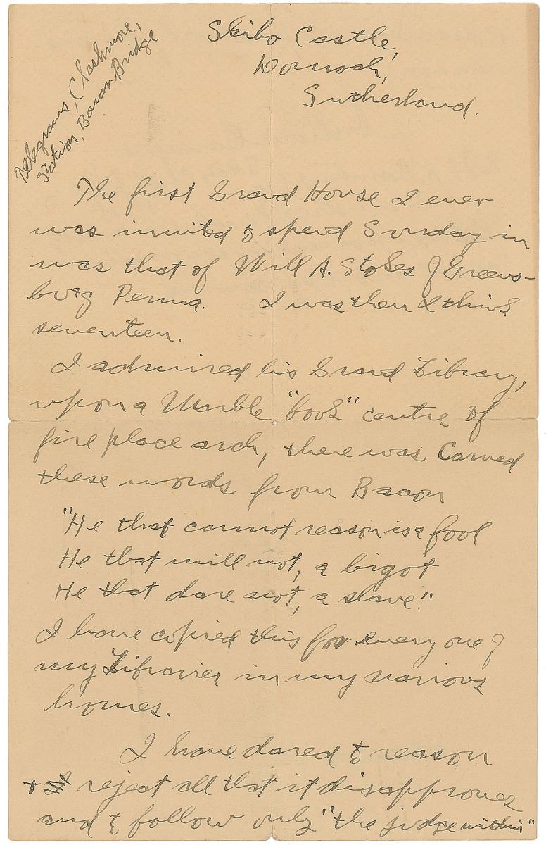 ALS, one page both sides, 5.5 x 9, July 1, 1905. Letter to W. R. Barnhart, written from Skibo Castle in Scotland. In full: “The first Grand House I ever was invited to spend Sunday in was that of Will A. Stokes of Greensburg Penna. I was then I think seventeen. I admired his Grand Library, upon a marble ‘book,’ centre of fireplace arch, there was carved these words from Bacon: ‘He that cannot reason is a fool, He that will not, a bigot, He that dare not, a slave.’ I have copied this for every one of my Libraries in my various homes. I have dared to reason & reject all that it disapproves and to follow only ‘the judge within,’ conscience, the product of divine reason.” Central vertical and horizontal folds (one vertical fold passing through a single letter of the signature), a couple small edge separations, and overall toning, otherwise fine condition. Accompanied by a 1929 newspaper clipping quoting this letter.