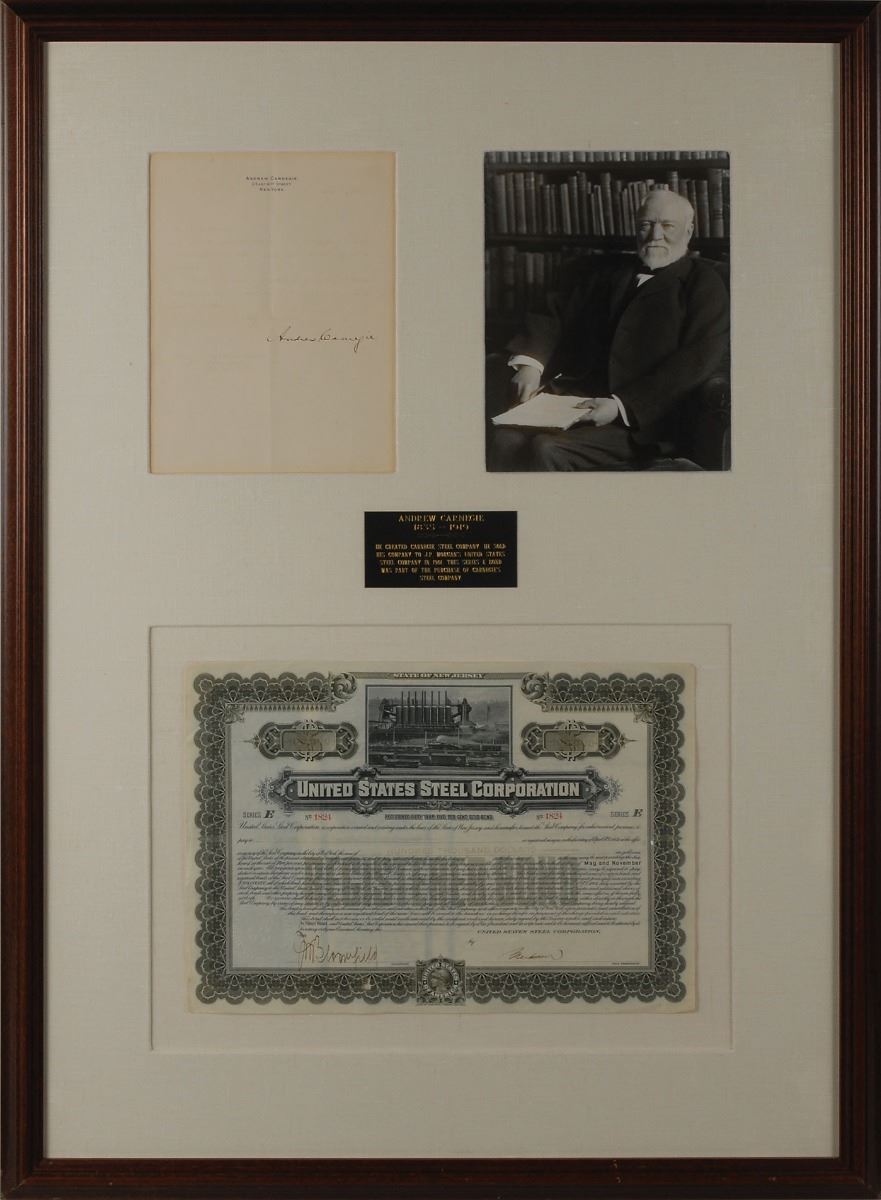 TLS, one page, 6.5 x 8.5, personal letterhead, April 13, 1909. Letter to Professor Henry Fairfield Osbourne, in full: “Yours of April 11th received. I am not surprised that you were delighted with Hale. He is a genius of who much can be expected. We are in the midst of preparations for leaving and I cannot possibly add to my engagements, but upon my return shall be glad to see you.” Cloth-matted and framed with a plaque, portrait, and a United States Steel Corporation promissory bond for $100,000 to an overall size of 23.25 x 31.5. In fine condition, with the typed body of the letter extremely faded but readable under magnification; the items displays as an attractive signature on Carnegie’s letterhead. Oversized.