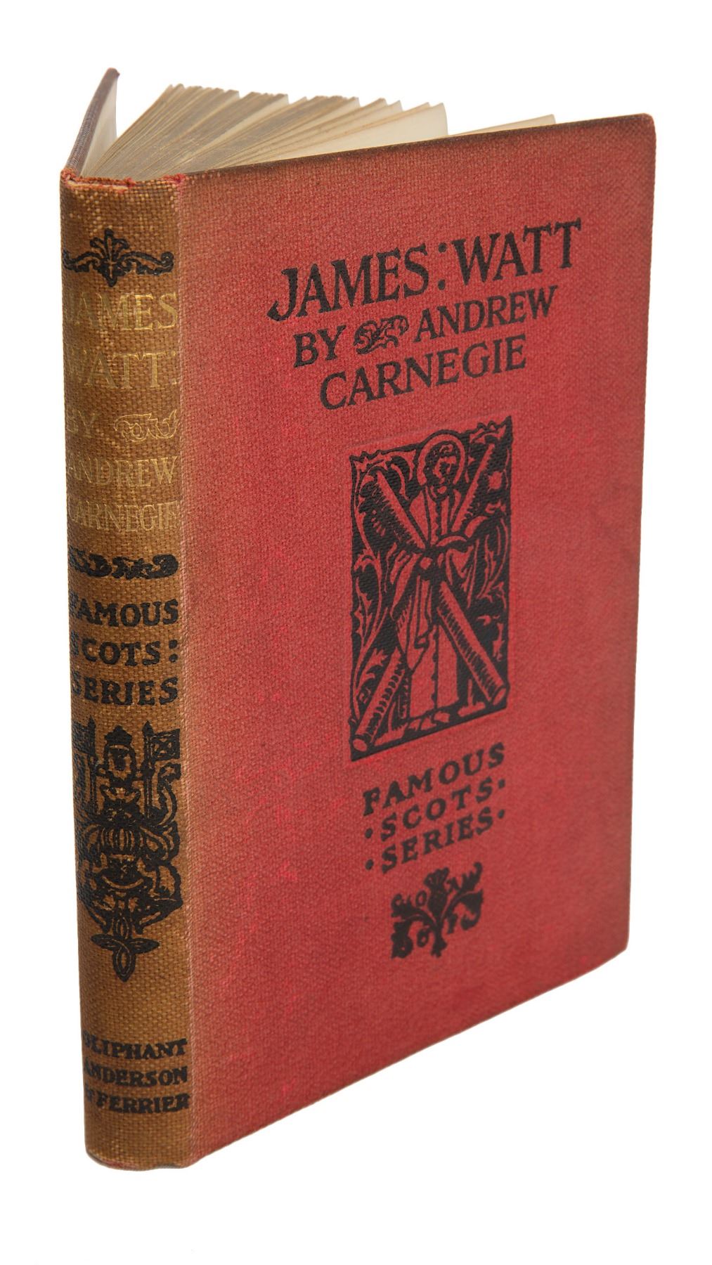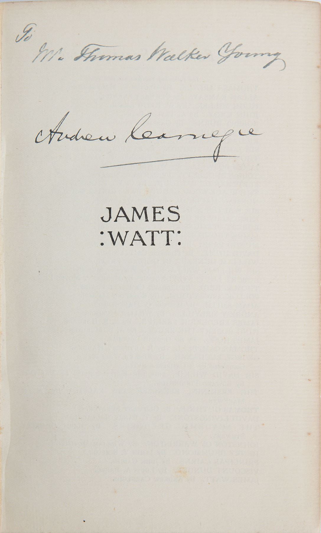 Signed book: James Watt. First British edition. Edinburgh and London: Oliphant Anderson & Ferrier, 1905. Hardcover, 5 x 7.5, 164 pages. Signed on the first free end page in ink, "Andrew Carnegie," with an inscription in another hand, "To Mr. Thomas Walker Young." In very good to fine condition, with sunning to the spine, and heavy toning to the two flyleaves, not affecting the signature.