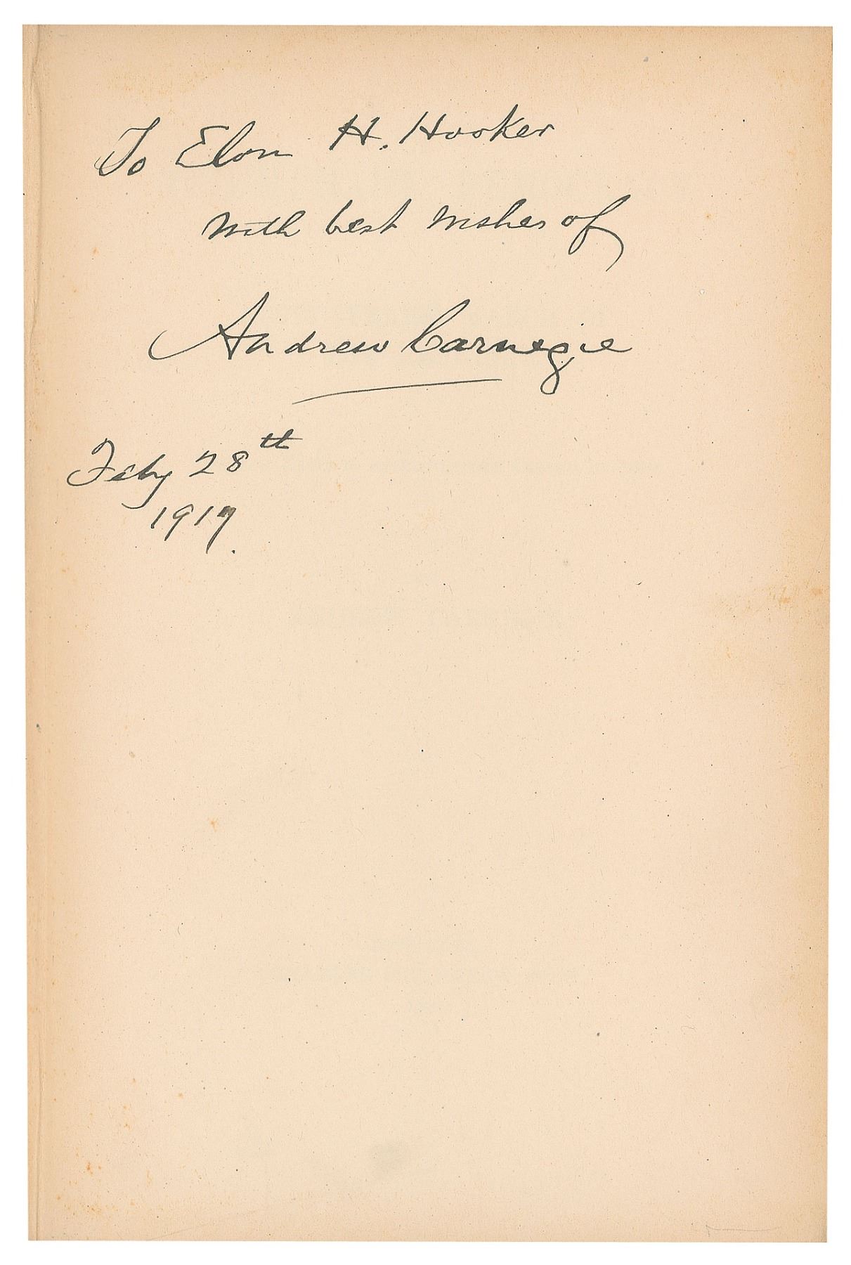 Signed book: Triumphant Democracy: Sixty Years' March of the Republic. Later printing. NY: Charles Scribner's Sons, 1912. Hardcover, 6.25 x 8.75, 549 pages. Boldly signed and inscribed on the first free end page in ink, "To Elon H. Hooker, with best wishes of Andrew Carnegie, July 28th, 1917." Autographic condition: fine. Book condition VG/None, with a cracked front hinge. Elon H. Hooker was the founder of the Hooker Chemical Company at Niagara Falls, one of the leading early American producers of chemicals and plastics.