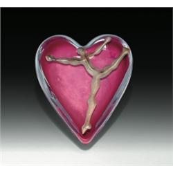 Andrew Fote clear-encased, heart-shaped paperweight, of mottled ruby with a silver dancer engrav...