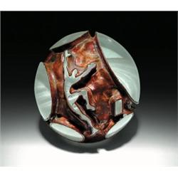Andrew Fote round, copper-encased abstract design paperweight, with circular and rectangular raised windows, and the silhouette of a man among a white frosted interior swirl. Signed. Diameter 3 1/8". $250-350