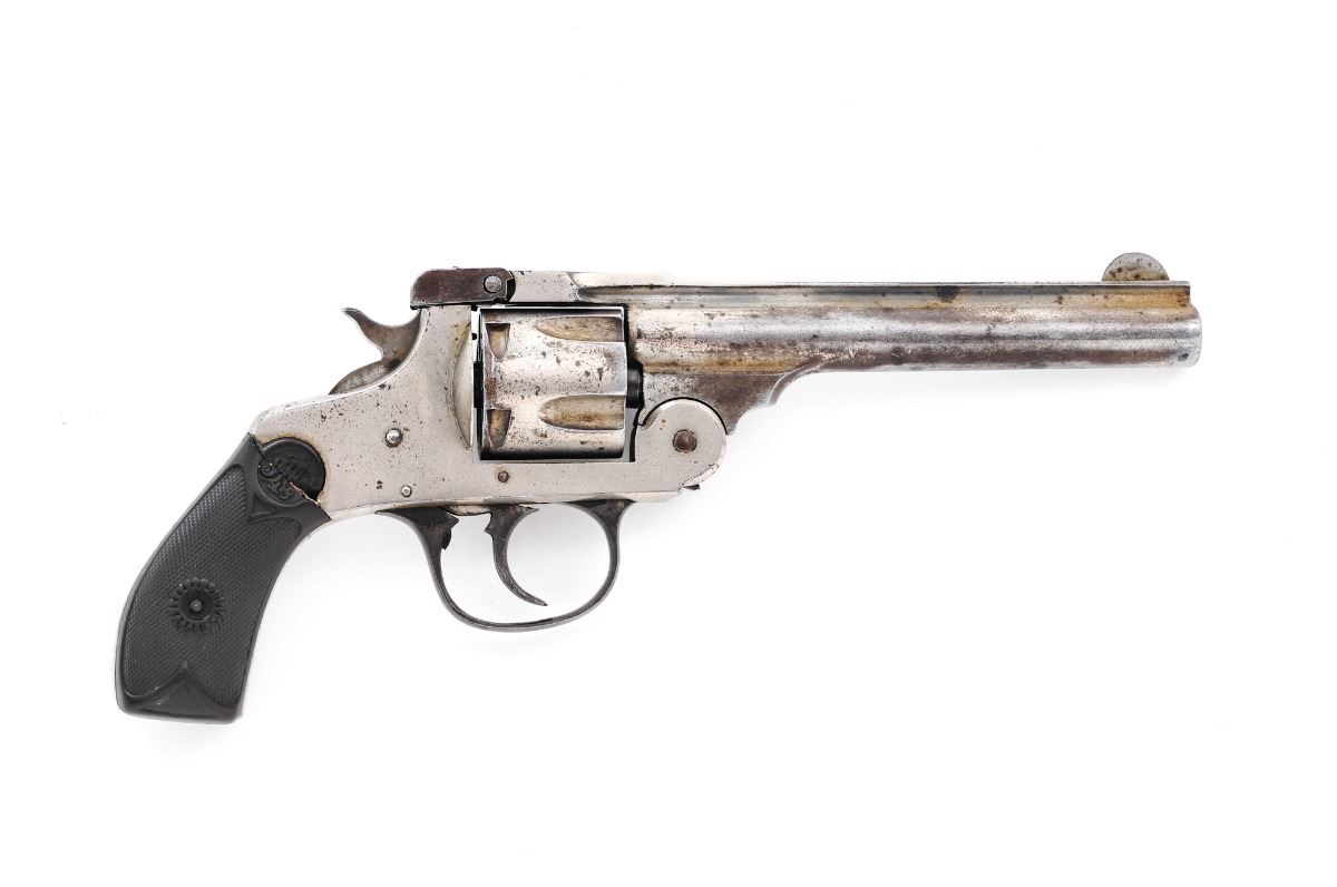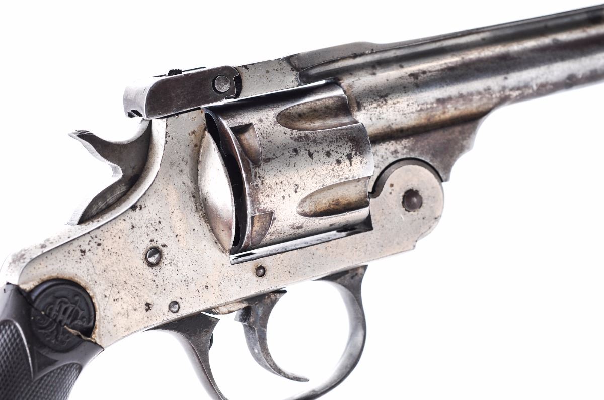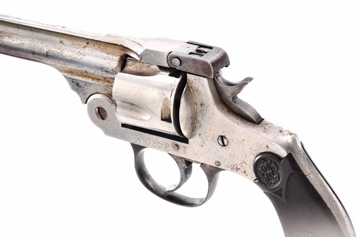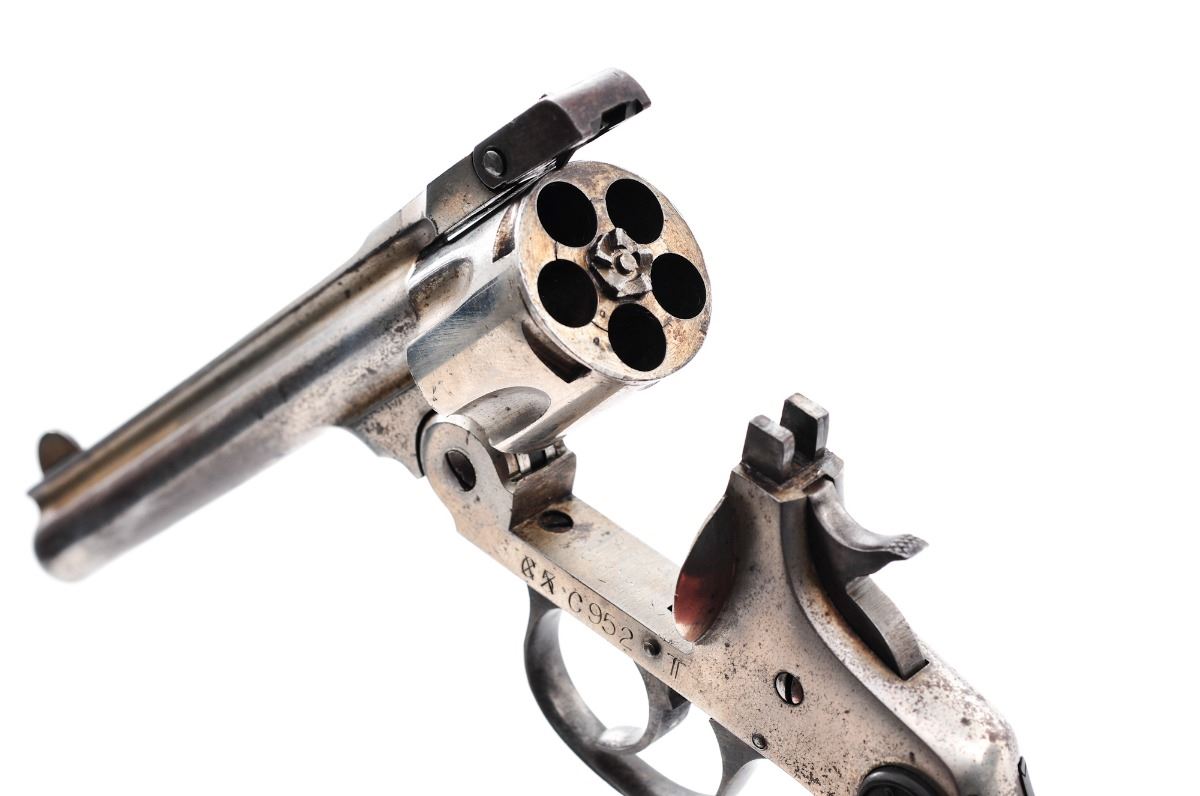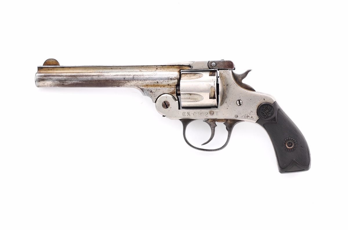 Andrew Fyrberg & Co., Hopkinton, Mass. Double Action Revolver, #C952T, .38 cal., 5'' barrel, nickel finish, checkered hardwood grips. Left side of frame marked ''C5'' (x'd out) and marked ''C952T''. Top of barrel with maker's mark and 1903 patent date. Inside bottom edge of frame is electro-penciled ''28/35'' over ''C30932''. Revolver functions in double action only. Condition is good retaining approx. 60%-65% nickel finish, with darkening to underside of barrel, as well as dark spotting to cylinder and portions of frame. Right grip is cracked near top edge. Break-top action functions nicely and barrel remains tight to frame; bore is good with some corrosion at mid-point. Est.: $100-$200. (C&R)