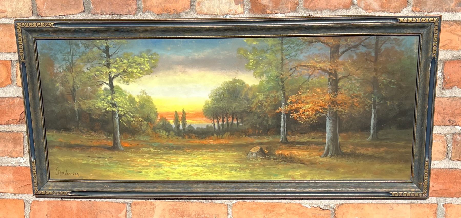 14 1/2" by 32 1/2" framed. Andrew Severin Gunderson (1888 - 1964) was active/lived in Illinois, Iowa. Andrew Gunderson is known for Illustrations. Andrew Severin Gunderson was born June 16, 1888 in Wallingford, Iowa. He was a self-taught illustration pastel artist and opened his own studio and the A. Gunderson Art Company in Chicago at age 18. In 1915 he moved to Monee, Illinois and set up a studio in his home. For many years he sold his pastels through Mages (letter Vilas-Mages) framing house catalog company often producing the same scene in various sizes. Most of his pastels are landscapes and still lives. These were drawn from his imagination. There is almost always water in his images along with trees, often white birch trees. In addition his pastels often had a log cabin or Indian tepee in the scene. He intentionally priced his artwork low, believing that everyone needed beauty in their lives and homes. His older pastels are signed A. Gunderson, later pastels just "Gunderson". There are no known unsigned pastels of Gunderson since he always signed his pastels when finished. Gunderson passed away September 4, 1964 in Monee, Illinois.